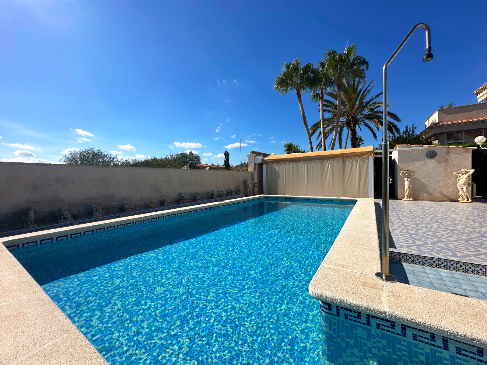 Your dream of a fully furnished, move-in-ready home surrounded by the beauty of Playa Flamenca – Orihuela Costa – is about to become a reality. Don't miss out on your perfect opportunity! This Mediterranean-style villa offers the ultimate coastal lifestyle, located only minutes away from the golden beaches of the Mediterranean, the prestigious Villamartín Golf Course, and the famous La Zenia Boulevard. Orihuela Costa has it all: relaxation, adventure, or a mix of both. This mediterranean style family home has been meticulously designed for your comfort and features high-quality finishes and essential modern conveniences. It has everything you need for a hassle-free move. This stunning, tailor-made, fully furnished luxury villa with heated salt water swimming pool offers the best lifestyle in a privileged setting. As soon as you step inside, you'll be welcomed by a bright and welcoming atmosphere thanks to its south orientation that allows natural light to flood every corner. The villa is conveniently located on one level and boasts three spacious double bedrooms, perfect for resting and relaxing, as well as two bathrooms with walk-in shower. The master suite with a wall-to-wall wardrobe and ensuite bathroom offers a touch of sophistication, including underfloor heating for extra comfort. The separate kitchen, fully equipped with high-quality finishes, is a dream for food lovers and accesses perfectly with the dining room, creating the ideal space to share moments with family and friends. From the spacious living room and panoramic lounge area, with a bespoke snooker and dining table, american size fridge - freezer where you can enjoy a charming view of the pool and garden. This villa also includes many extras and a number of exceptional amenities: ducted air conditioning for personalized comfort, built-in wardrobes that optimize space, and additional in the back garden for extra storage, you enjoy a practical garden shed for convenience. Enjoy the perfect facilities for relaxing and staying active. The location is unbeatable, just 1,8 km from the beach and surrounded by services such as shopping centres, doctors, schools and parks, making it the ideal place to live.