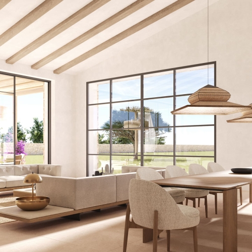 New Villa for Sale in Marratxinet Mallorca. A project for a luxurious residence which has just be granted full planning permissions to be built in the next 18 months, in the picturesque area of Marratxinet, one of Marratxí’s most exclusive neighbourhoods, popular with families because of its authentic village feel but with the advantage of its close proximity to Palma de Mallorca the airport and international schools. This new project is for a five bedroom home with four bathrooms, which on the ground floor has a large open plan kitchen lounge and diner with eight meter wide full hight sliding doors which open out on to an easy to maintain terrace garden with a south facing pool and outside dining area. Designed with the modern family in mind who want an open plan space which in the warm summer months can be connected to the terrace and pool. Ideal for entertaining and hosting friends. A ground floor double bedroom is conveniently positioned next to a full bathroom making it ideal as a guest bedroom or home office which can be used as a guest bedroom when necessary. On the upper floor at the front of the property are two good sized double bedrooms with a complete bathroom between them. The two double bedrooms to the rear of the property overlooking the patio and pool both have dressing rooms and en suite bathrooms. The details of the distribution and dimensions of the rooms are below We also have the full plans and the information of the proposed installations On the ground floor Garage 17.55m2 Entrance 12.55m2 Bedroom 1º 9.85m2 Bathroom 1º 5.10m2 Open Plan Lounge Kitchen 53.25m2 Terrace 94.70m2 Pool 16.95m2 On the first floor Bedroom 2º 16.50m2 Bedroom 3º 15.50m2 Bathroom 3º 4.05m2 Bedroom 4º 12.00m2 Bathroom 2º 5.95m2 Dressing Room 2º 7.05m2 Bedroom 5º 10.25m2 Bathroom 4º 3.85m2 Dressing 1º Room 6.25m2 Please contact us if you require more information about this new villa for sale in Marratxinet or if you’d like to visit the site as construction begins on this property. Marratxí Marratxi is a collection of villages and urban areas which are situated just outside Palma de Mallorca. These included  Pont d’Inca, Portol and Sa Cabaneta all of which are poplar with those who work in Palma de Mallorca. Marratxinet Marratxinet the original foundation agricultural settlement of Marratxí. The municipality takes its name from this small hamlet, but as the agricultural income declined in the middle of the 19th century the administration of the municipality moved to the more wealth settlements of Sa Cabaneta and Marratxi. The original village remains as a gem of traditional Mallorcan architecture along one street called Sa Font. Building A House In Mallorca and New Constructions