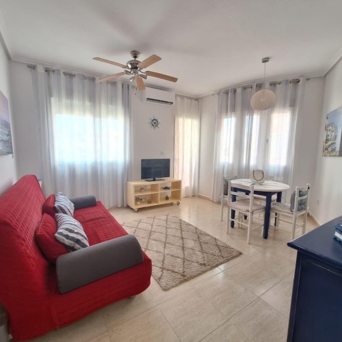 This modern, light and airy, fully-furnished, 2 bed 2 bath, first floor apartment is only 150 metres from the sea, in a quiet residential area and within easy walking distance of a variety of shops, bars and restaurants in the lovely resort of La Valeta which is just seven minutes’ drive from the bustling resort of Torrevieja. The apartment consists of a spacious lounge with patio doors leading to a covered terrace with views to the sea and tennis courts, American style kitchen, hallway, master bedroom with en-suite bathroom and walk-in shower, twin bedroom and family bathroom. The property is well-presented, with stylish furniture, air-conditioning in the lounge, fully-fitted kitchen and mirror-fronted wardrobes. The attractive, well-kept apartment block has a lovely community pool, children pool and garden area. There are lifts to all floors. Private off-road parking is available if required. La Valeta is a lovely resort just 3 kilometres south of the very popular and cosmopolitan town of Torrevieja which has a long promenade, several town squares, a vast array of facilities including shopping centres, ten-pin bowling, cinema with original soundtrack films available, traditional street markets, water park, themed museums, marina and parks. There are lots of beautiful beaches and golf courses all within very easy reach and very good motorway links. This is an ideal property for full time living, holidays or investment and should be viewed to be fully appreciated.