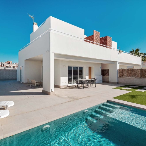 Contemporary Semi-detached villa Overlooking Green Parkland – Marketed exclusively by Horadada HomesThis exclusive residential is characterized by its fantastic location, located just a few meters from the beach of “Las Higuericas” in Torre de la Horadada and its spectacular views to the sea.Designed with both comfort and functionality in mind, the property boasts a well-balanced layout and bright interiors, complemented by its own private swimming pool and inviting outdoor spaces—perfect for enjoying the Mediterranean climate year-round.The main living area is arranged in a bright open-concept layout, seamlessly connecting the lounge, dining area, and fully fitted kitchen. Large windows and sliding doors flood the space with natural light while creating a strong connection to the outdoor areas.On the ground-floor, the villa features a spacious double bedroom and a modern bathroom. This bedroom enjoys direct views of the pool and private outdoor area, with convenient access leading straight outside—ideal for guests or embracing effortless indoor-outdoor living.Upstairs, two additional bedrooms provide comfortable accommodation, along with a second bathroom finished to an very high standard indeed.A key highlight of this home is its open orientation facing landscaped parkland. With no properties directly in front, the villa benefits from uninterrupted green views, enhanced privacy, and a calm, relaxing atmosphere.Outdoor living is a true standout feature. In addition to the garden and terrace, the property boasts a private rooftop solarium complete with a fully fitted summer kitchen, marble dining table, and seating area—all crafted from high-quality, weather-resistant materials designed for durability and year-round enjoyment. From here, you can relax, entertain, and take in sea views in complete comfort.This villa also benifits from a private parking space.Whether you’re searching for a permanent residence, a holiday escape, or a smart investment, this villa delivers an exceptional combination of modern design, quality finishes, and an enviable location.