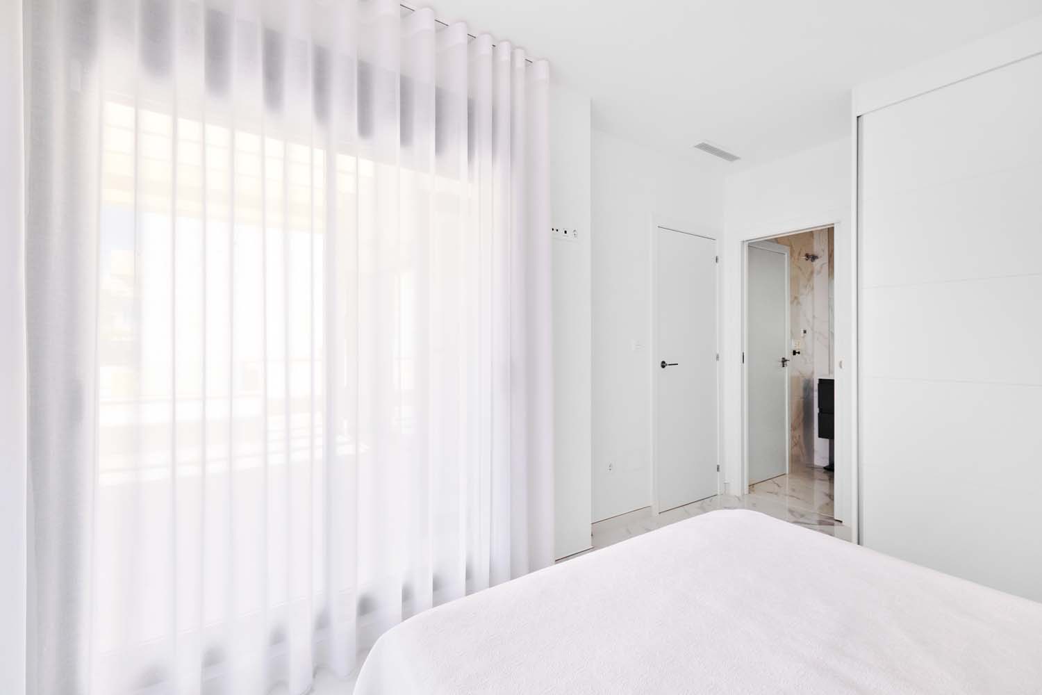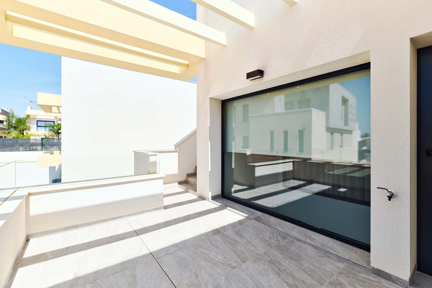 Fantastic opportunity to purchase a modern 3 bedroom, 2 bathroom detached villa with private swimming pool and off street parking, situated in a quiet cul de sac and small urbanisation on the edge of Los Montesinos town with an array of amenities and only 20 minutes drive to the beach. This beautiful villa is part of a community of only 6 detached villas in a small quiet cul de sac situated next to a green/park area and is only a few minutes walk to a large supermarket. To the outside of the villa is a spacious low maintenance plot with driveway accessible via a electric sliding gate, there is a private swimming pool with plenty of space for sunbathing and entertaining. The front door of the villa opens into a light and spacious open plan living/dining room with kitchen, the kitchen is a good size U shape with plenty of storage and there is a separate utility room next to the kitchen it is hidden and accessible by double white doors, in the living room there are patio doors which flood the room with natural light and give direct access out to the pool area. Also located on the ground floor is a bathroom with walk in shower and a large double bedroom with built in wardrobes and patio doors leading to the garden. A beautiful modern stone and glass staircase leads from the living area to the first floor of the villa, here there are two double bedrooms and a spacious family bathroom. Both bedrooms are light and good sized doubles with built in wardrobes, one of the bedrooms also benefits from direct access to the family bathroom and patio doors out to a terrace. The jack and jill bathroom has a large walk in shower and can also be accessed via a door from the hallway. There is another door in the hallway that leads onto the terrace where an external staircase leads to a large sunny roof terrace with lovely views, water and electric points should you wish to add a outside kitchen. This villa has a long list of added extras including ducted air conditioning, under floor heating in the bathrooms, private swimming pool, outside shower and electric gate. This property is immaculate, requires no work and is sold fully furnished, just pack your suitcase and enjoy! Viewing is highly recommended!