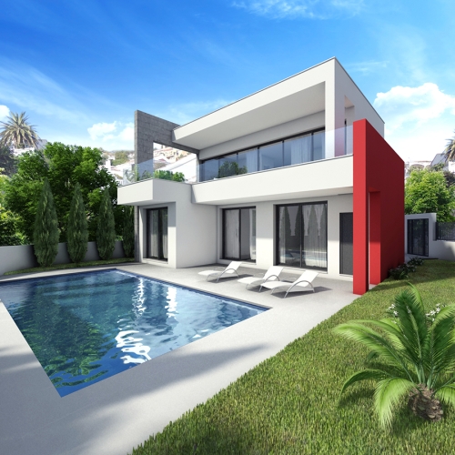 På første sal kan den betagende havudsigt nydes på den ene side af huset mens de karakteristiske bjerge kan nydes fra den anden side. Disse designer-villaer kombinerer funktionalitet og moderne arkitektur med varmen i det traditionelle middelhavsdesign.