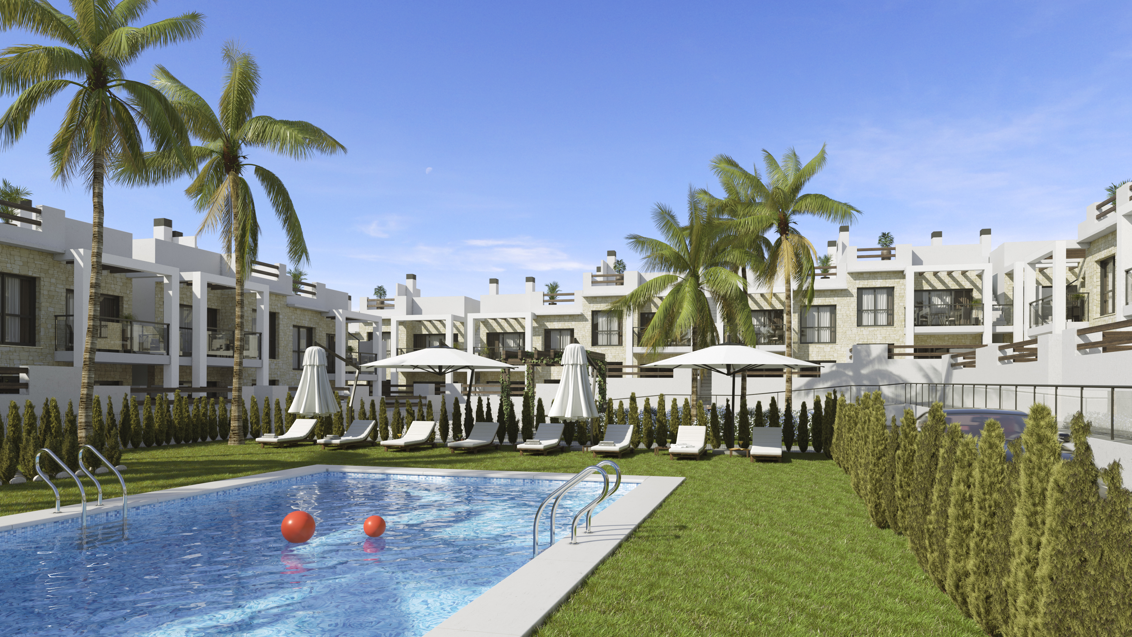 Komplekset har to semi-olympiske pools, rummelige anlagte områder og haver med opbevaringsrum.
