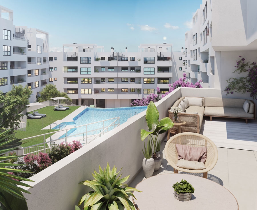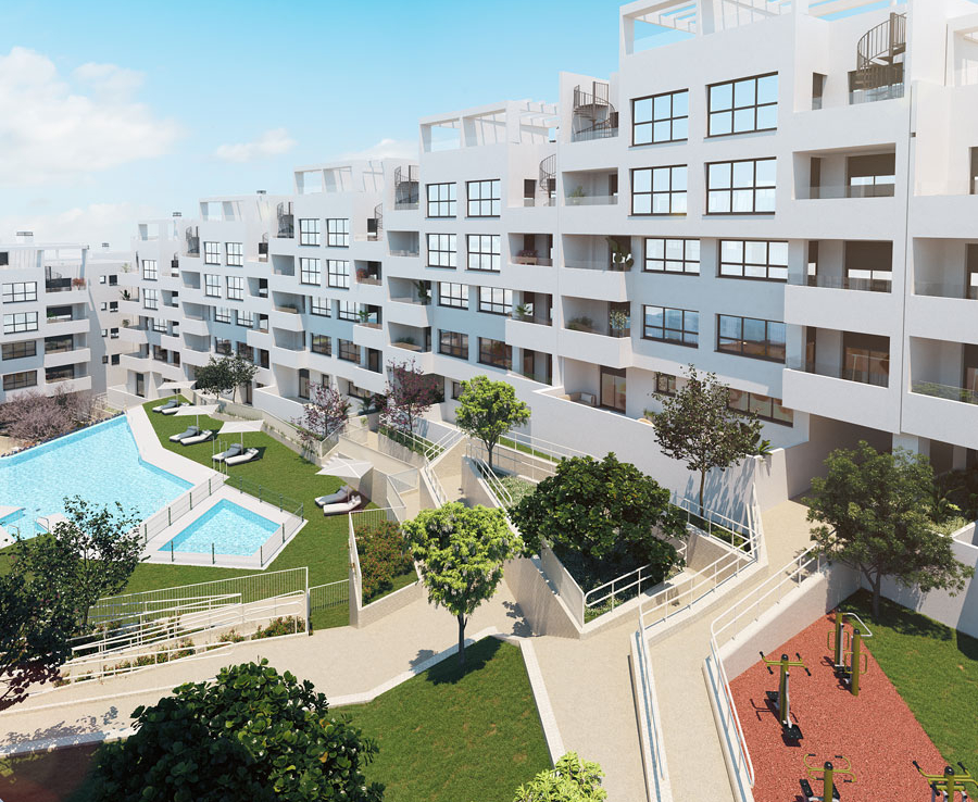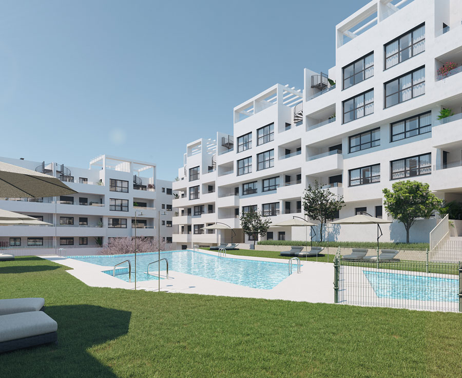 Komplekset er unikt i området: bygget i form af en "L", det omfavner en have på 2.500 m2, som inkluderer en stor infinity-pool med børneområde og legeområder. Derudover har du muligheden for at tilpasse mange af finisherne i dit hjem for at gøre det helt efter din smag.