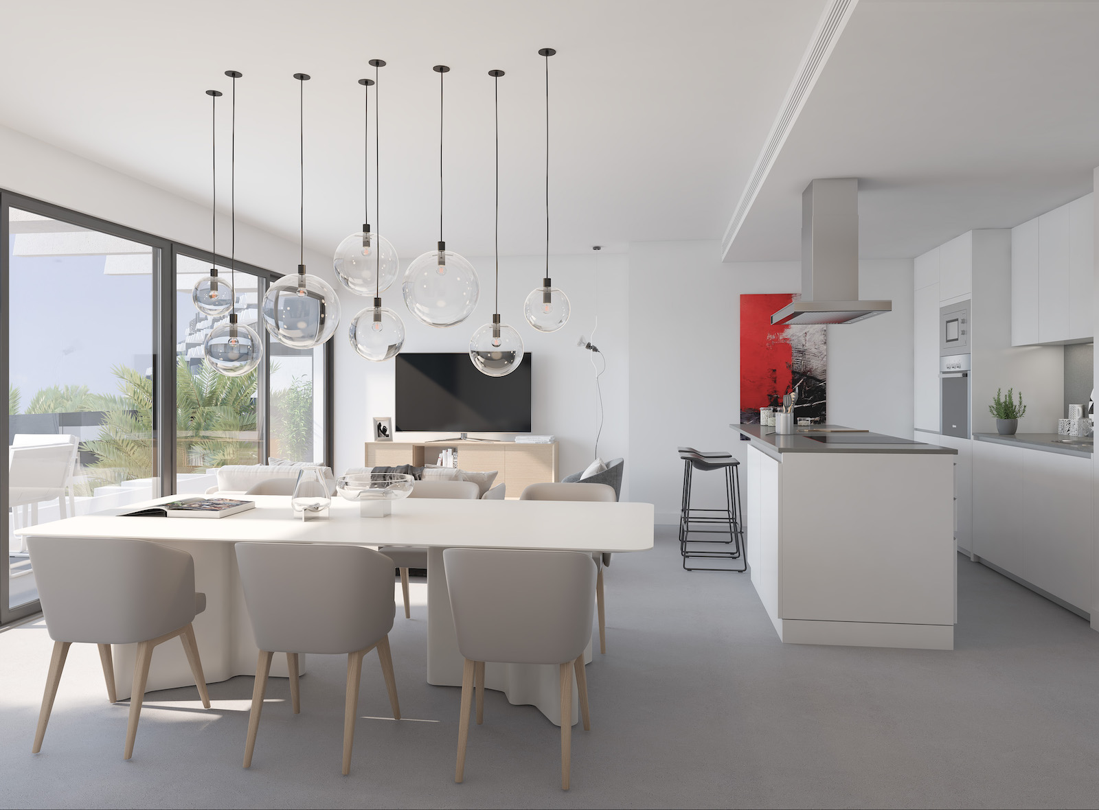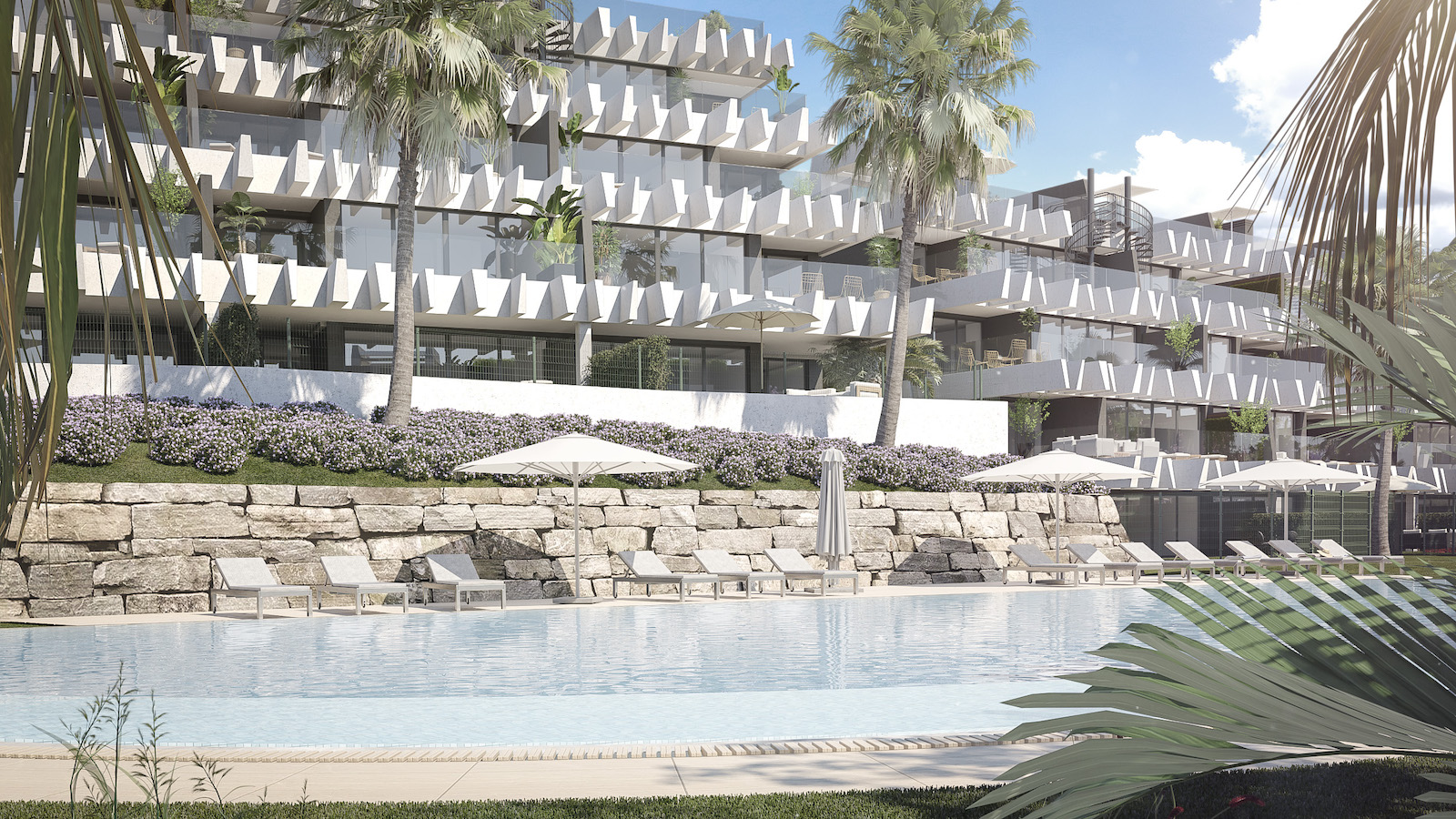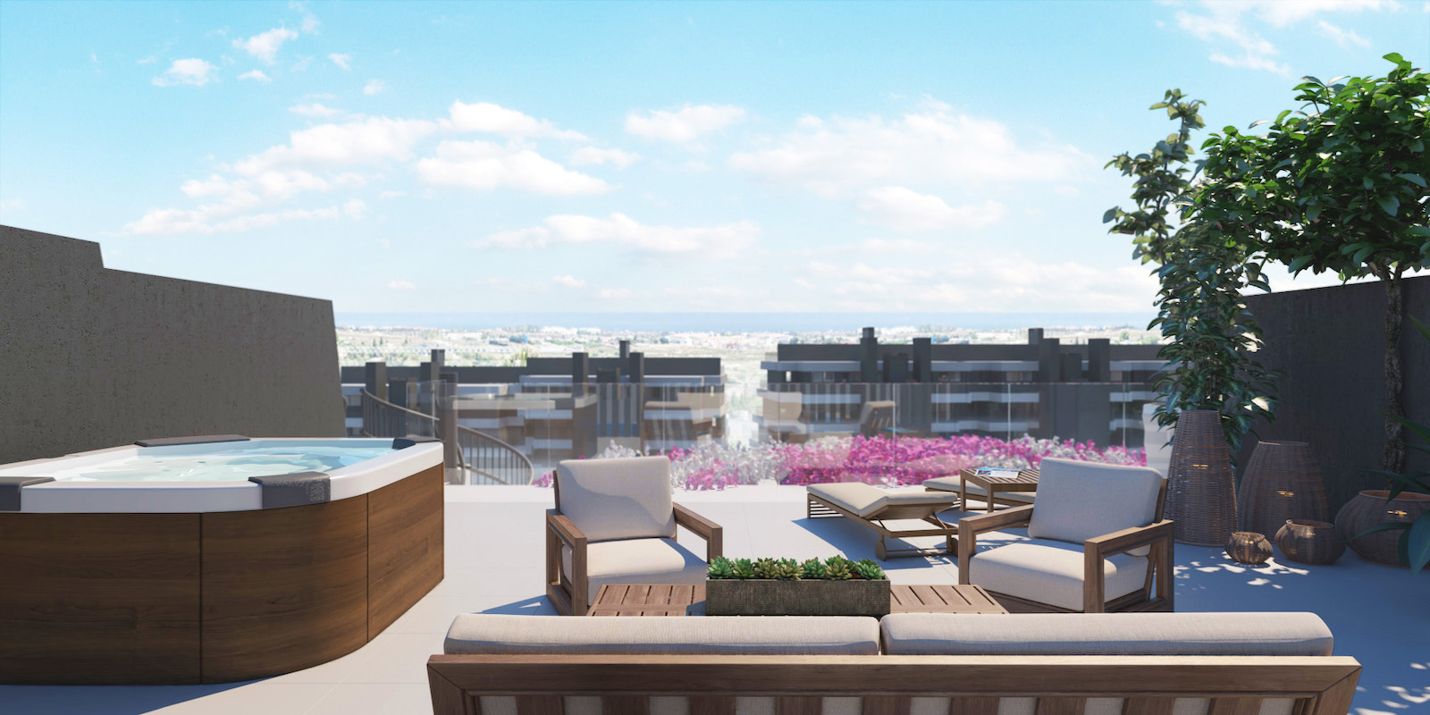Penthouses i Oasis 325 er udsigtspunkter på landskabet i Estepona. Deres terrasser med solarium er integreret som endnu et element i deres distribution. Grænserne mellem ydersiden og indersiden er slørede, så du kan nyde det bedste design med panoramaudsigt.