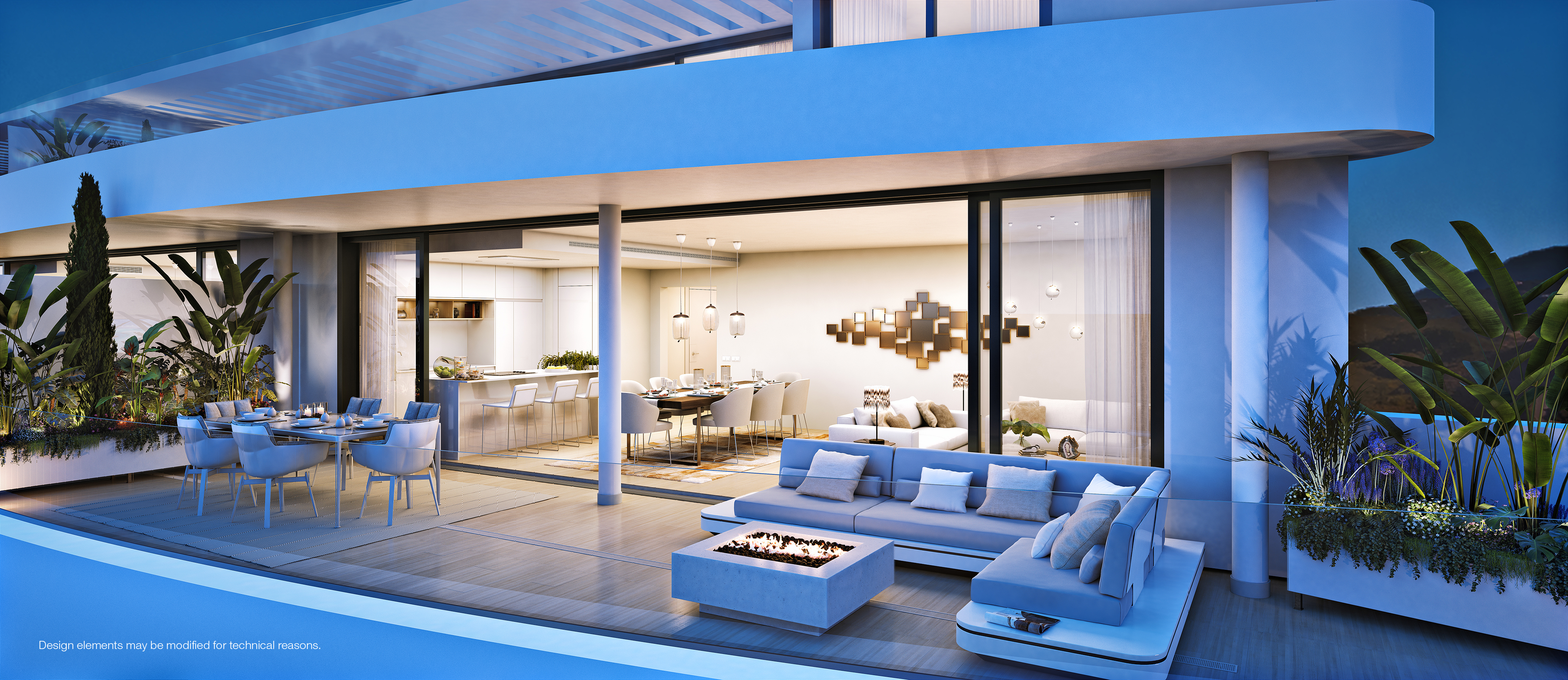 Lejlighederne er åbent indrettede, lyse, venlige samt rummelige og er designet til at genskabe oplevelsen af at bo i en villa. Soveområdet er flyttet til bjergsiden af ejendommen og dermed opnås en fornemmelse af mere boligareal, som kombineret med de store terrasser effektivt fordobler opholdsområdet. Denne lette interaktion mellem boligarealerne skaber et fleksibelt, åbent område, der er designet omkring det sydlige Spaniens klima og livsstil.