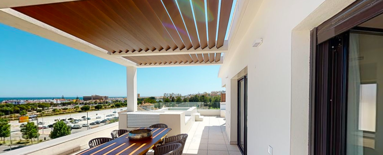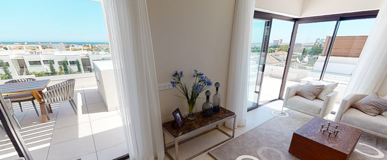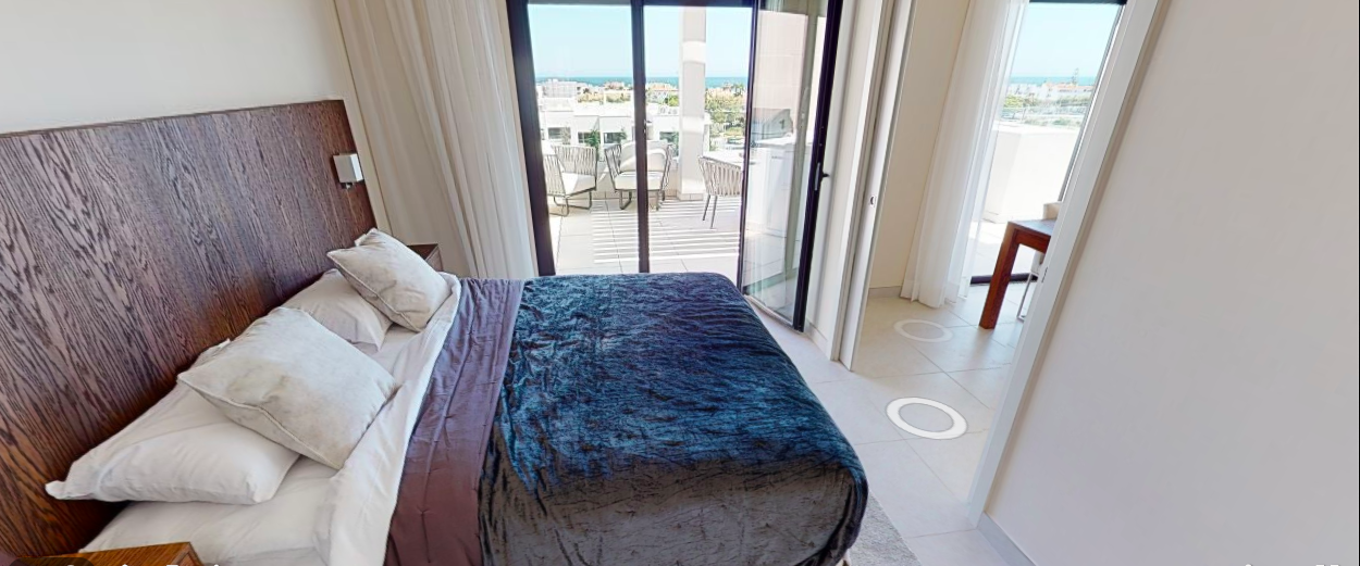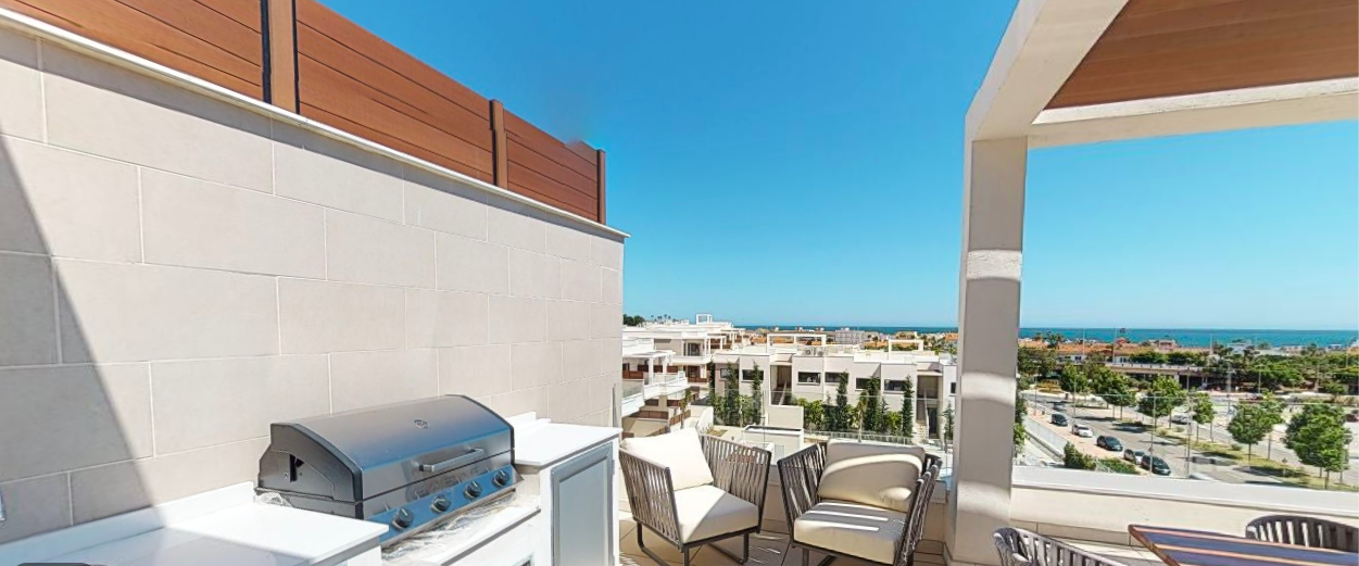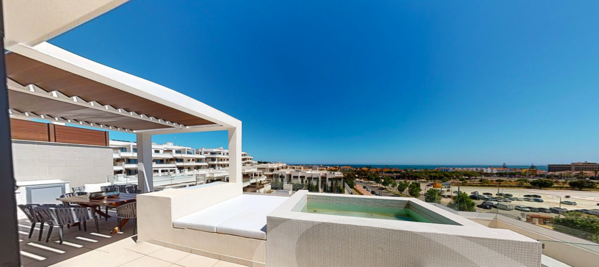 Denne penthouse har 2 soveværelser, 2,5 badeværelser. Det er syd og syd østvendt. Den byggede størrelse er 109,35 m2 og terrassens størrelse 96,17 m2. Det har en fantastisk havudsigt ned langs hele kysten og på terrassen er den fulde pakke inklusive; En lounge, en opholdsstue med pejs, et udendørs køkken med grill plus køleskab og et opholdsstue til solbadning og chill.