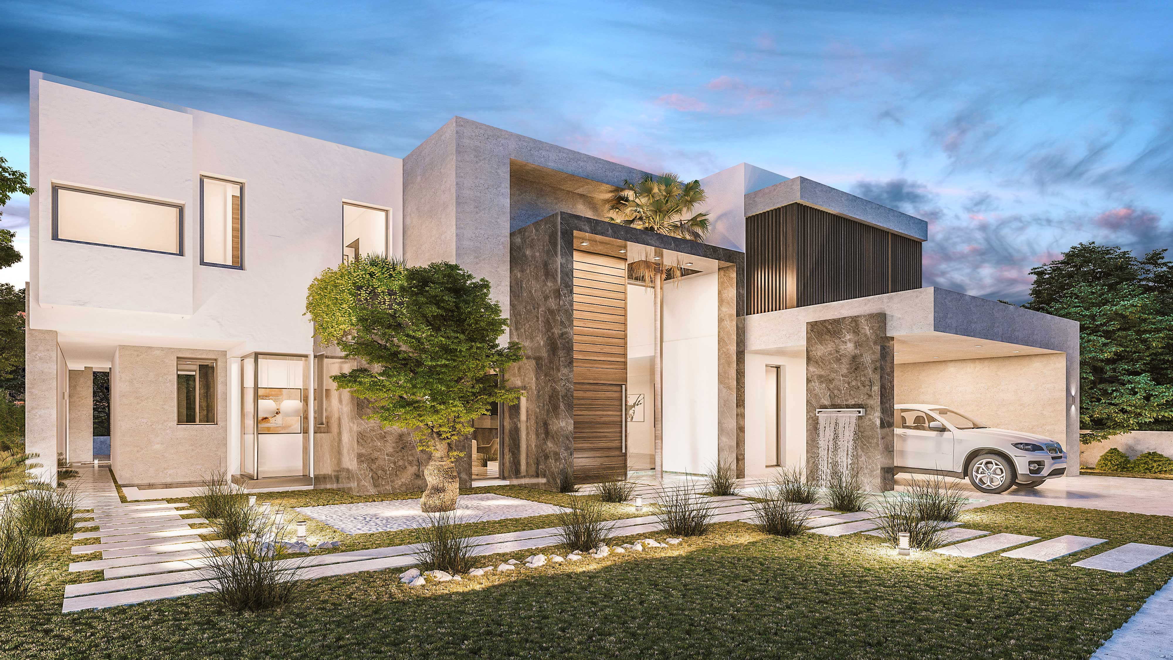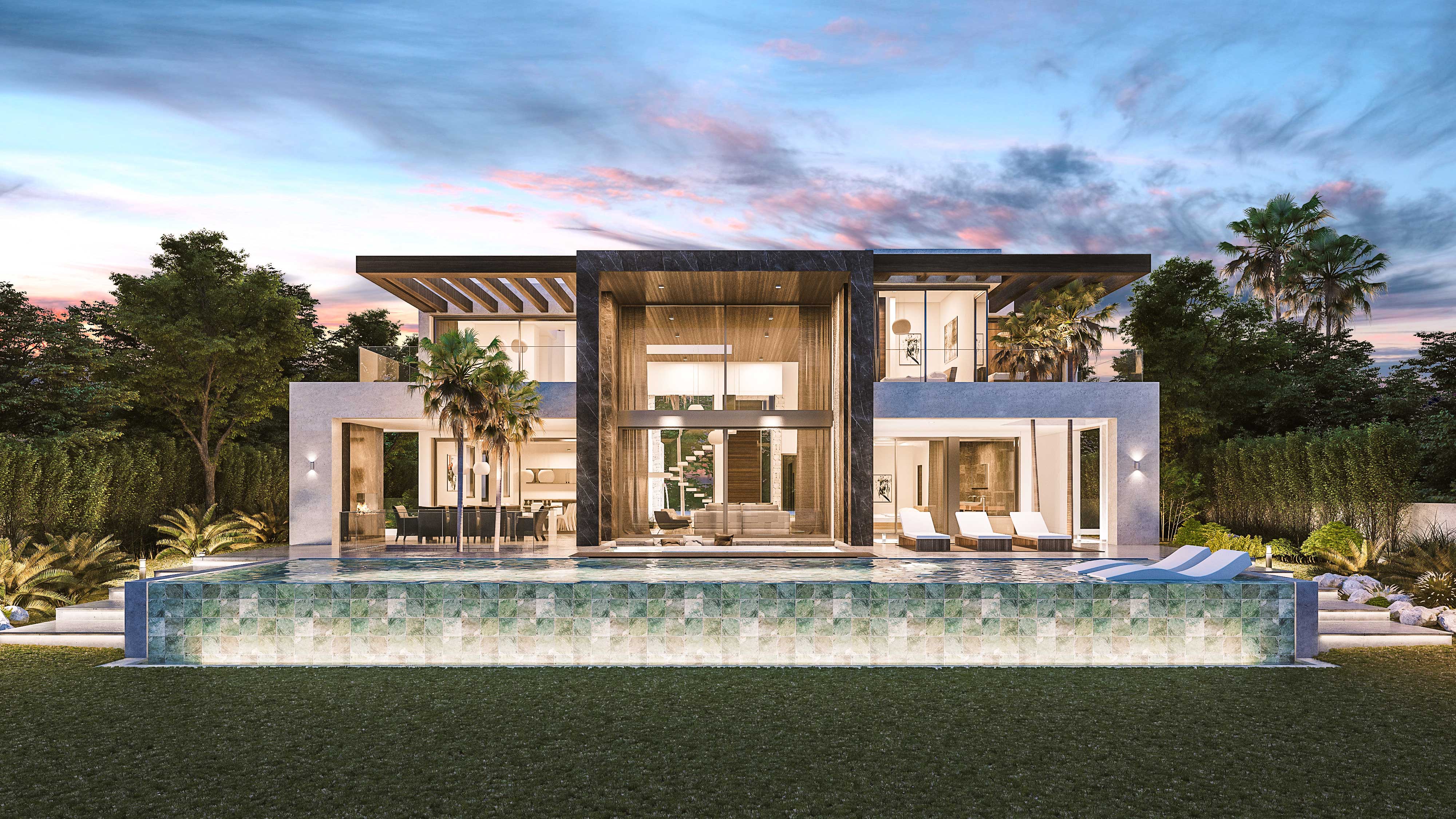 Designet af denne villa stammer fra en klassisk symmetri-fortolkning. Den bringer liv til en to etagers veranda, der minder om de monumentale bygninger i Rom. Bygningen er indrammet af naturlig sort sten og giver en minimalistisk effekt.