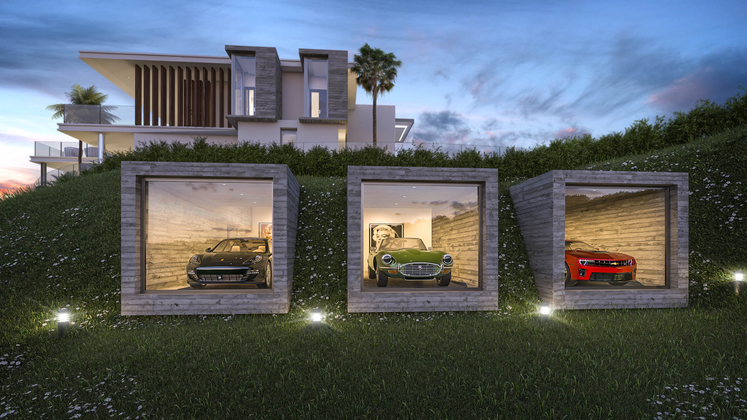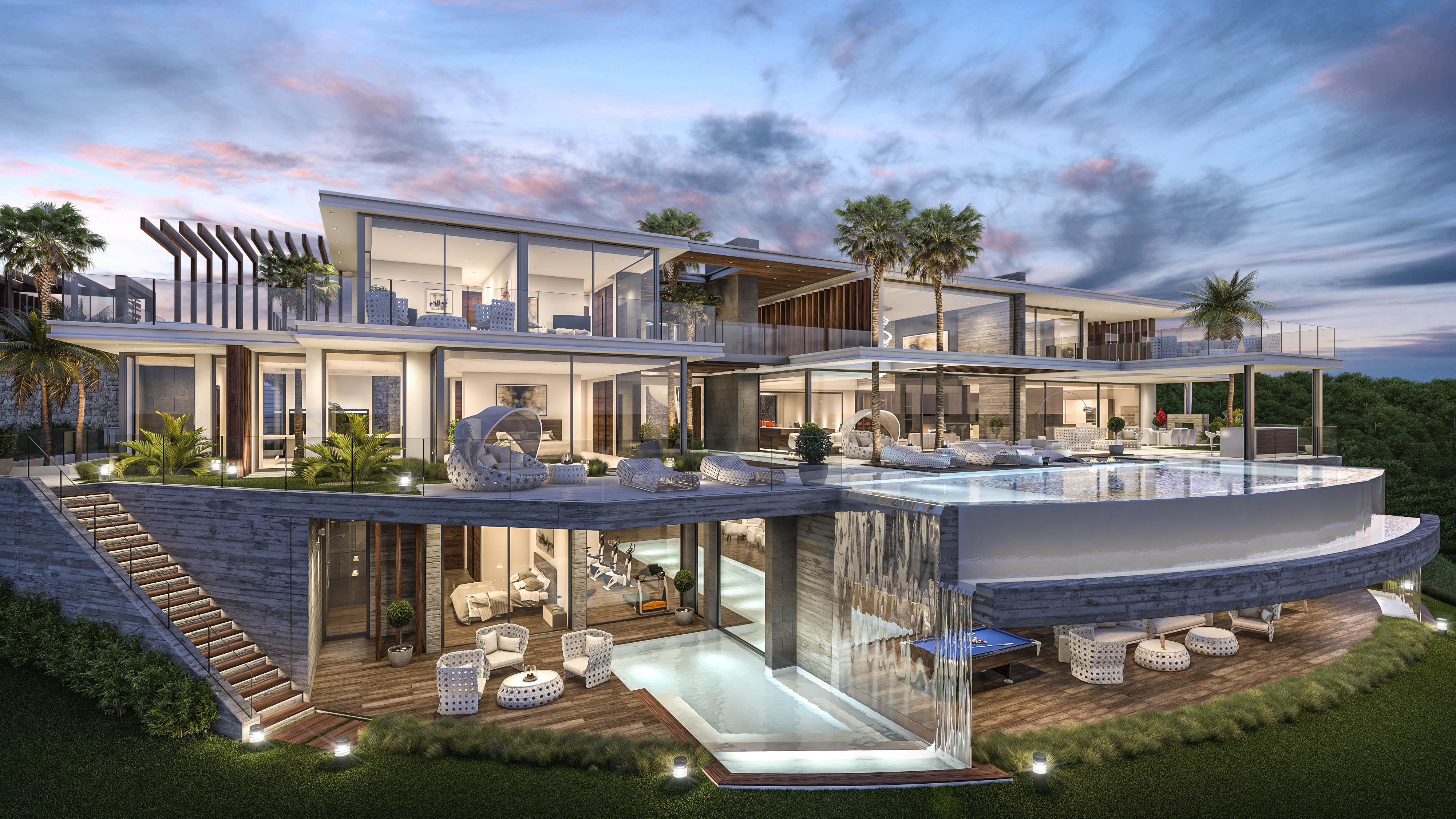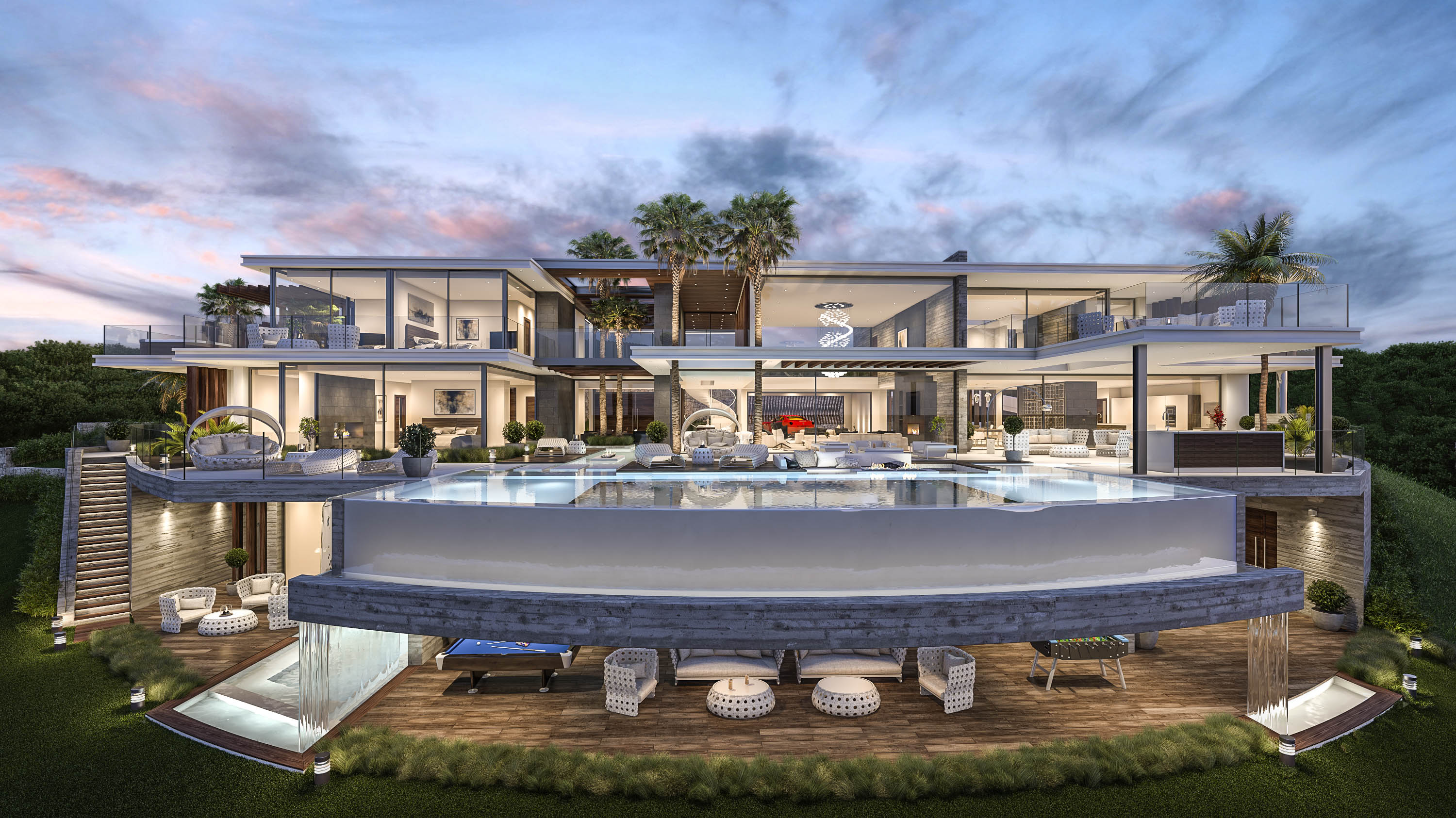 Kælderen er udstyret med en indendørs pool, spa, fitnessrum, massage værelse, vinkælder, tv og spillehal, privat biograf, vinkælder og en spektakulær garage med udsigt over havet og bjergene.