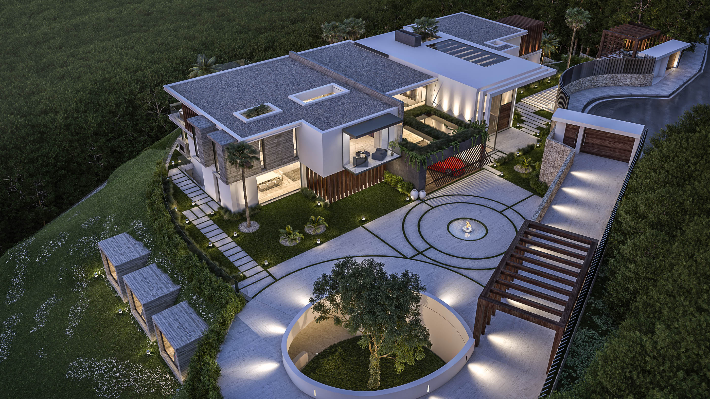 Husets hovedidé er at generere en række lysende rum (indvendig og udvendig) til haven og poolen med en rund geometri malet hvidt, men med nogle blikke i sten, der understreger visse arkitektoniske elementer.