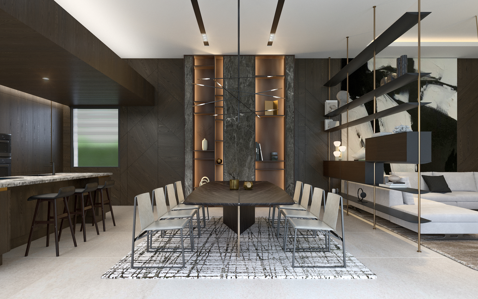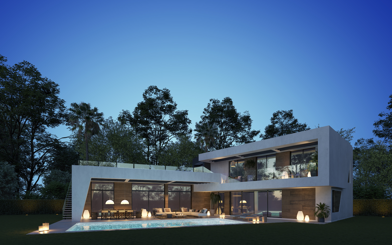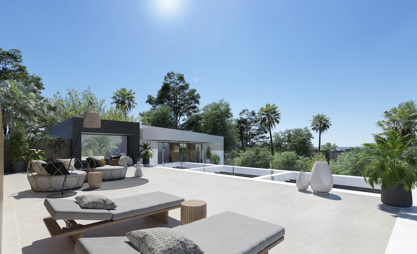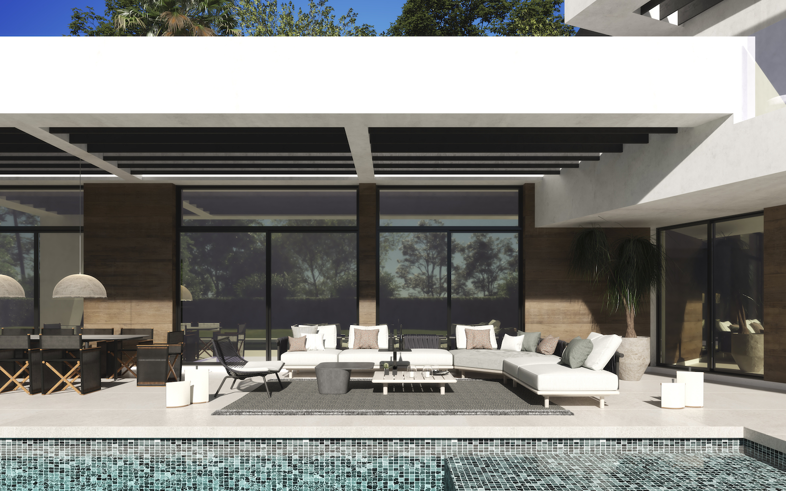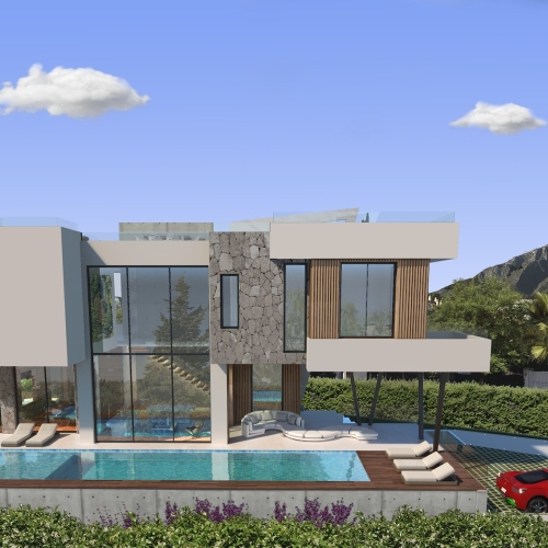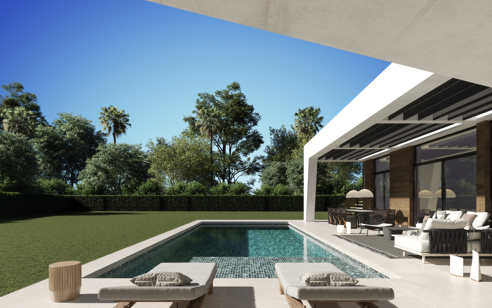 Villaen har 4 soveværelser og 5 badeværelser, et stort opholds-spiseplads på 66 m2, åbent køkken og behagelig terrasse med smuk have og swimmingpool.