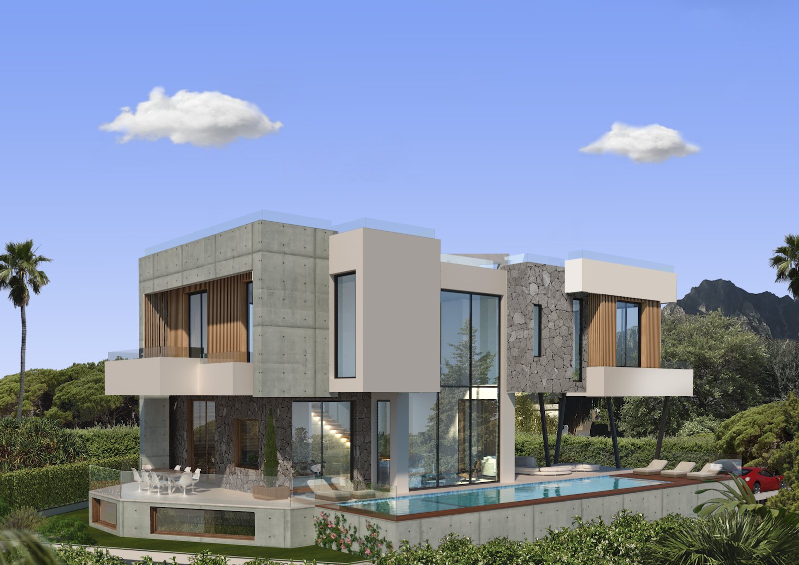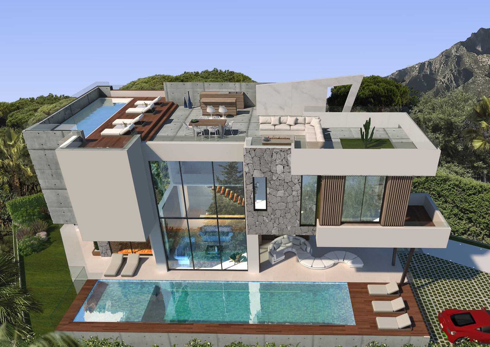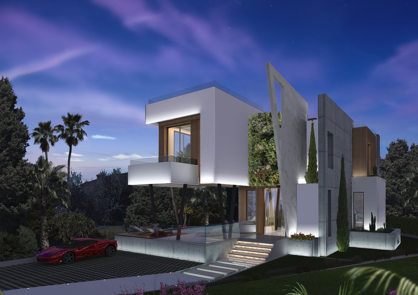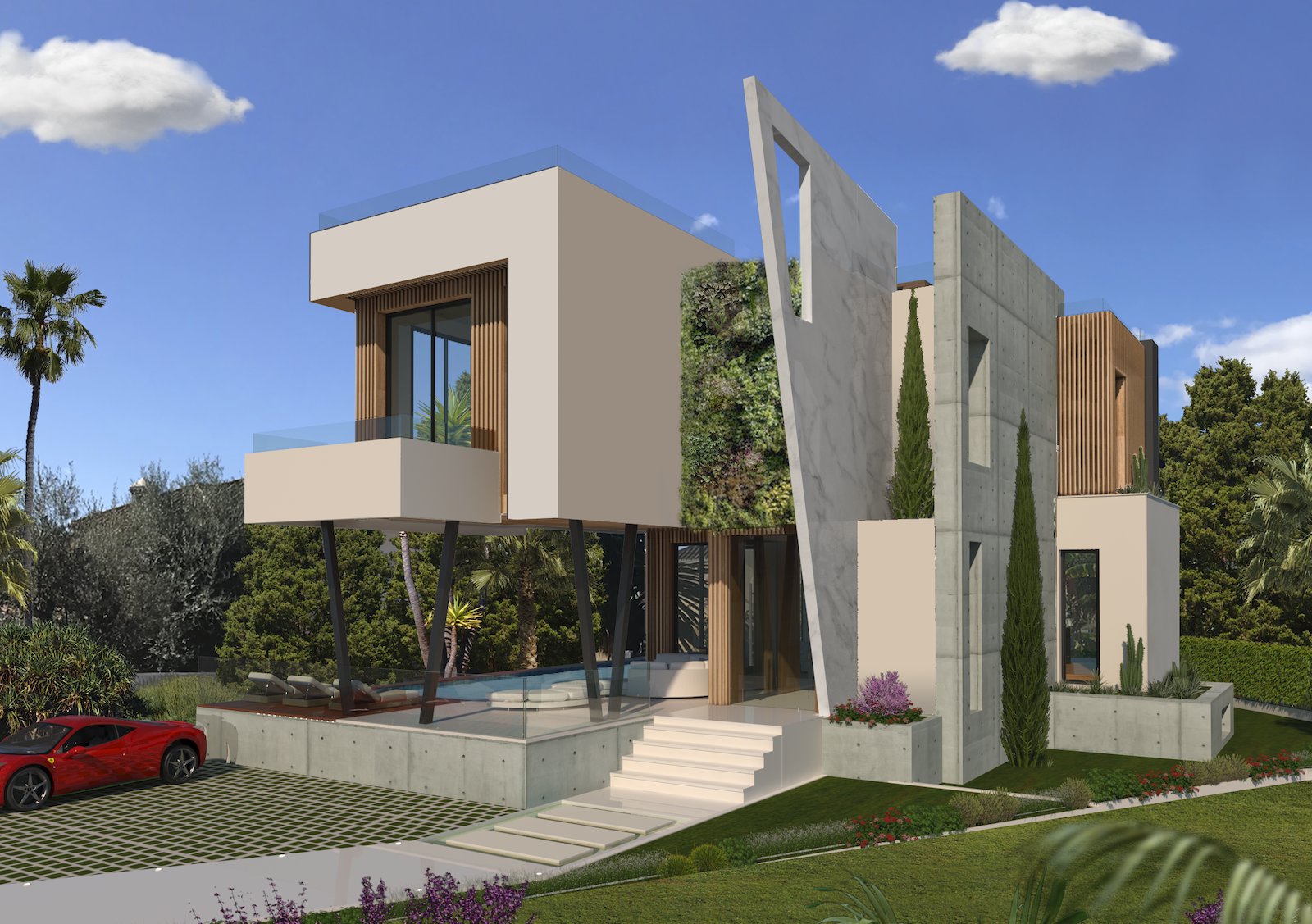 Modernistiske arkitektoniske kanter af glas og beton suppleres med tilføjelse af træfacader og botaniske mursten for at skabe store levende vægge. Dette iøjnefaldende ydre er perfekt afbalanceret af interiøret, der tilbyder designerboliger og de bedste hjemmekomfort, herunder et 5-stjernet spa, et højteknologisk domotisk system og luksuriøs brug af materialer, herunder Negro Marquina marmor og sten, samtidig med at man respekterer miljøet.