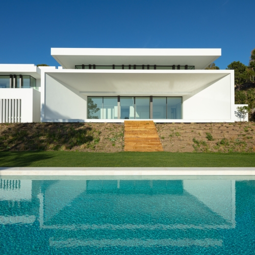 Denne villa har en fantastisk panoramaudsigt over havet, Gibraltar og Marokko. Befinder sig i et luksuriøst privat og roligt område nær hotellet og golfklubben i Marbella. Innovation og stilarten er til stede i hvert hjørne af denne villa, der integrerer perfekt i det privilegerede miljø, hvor den ligger.