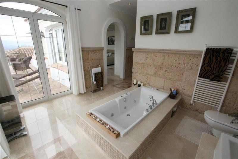 The upper level is a true private retreat, featuring an elegant and spacious master suite with walk-in dressing room, a luxurious bathroom with sunken bathtub, and a beautiful terrace with panoramic views to the sea and of the Sierra de las Nieves. A second en-suite bedroom completes this peaceful floor.
