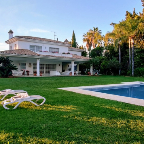 This stunning south facing villa is very close to the Guadalmina Golf Course, 350 meters distance to the beach, walking distance to all amenities and only 5 minutes drive to Puerto Banus, Marbella.