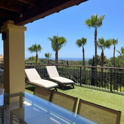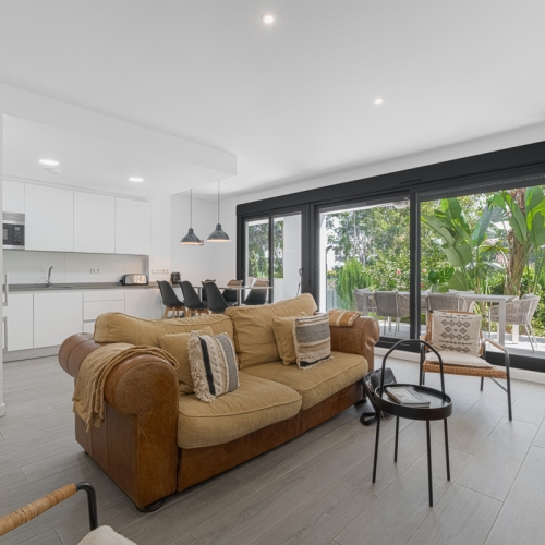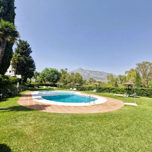 BEACHSIDE • WALKING DISTANCE TO MARBELLA CENTRE & ALL AMENITIES • Cheerful corner ground floor two bedroom apartment just steps from the beach. Located in a very desirable complex with lush mature gardens and swimming pool, right on the promenade, just a stone's throw away from all the restaurants and amenities of Marbella centre and Marbella's Golden Mile. The apartment consists of an entrance way, ample living/dining room, master bedroom with bathroom en suite, guest bedroom with balcony, bathroom, a functional fully fitted kitchen and utility room. The living room and master bedroom lead onto a quaint terrace, perfect for breakfast or al fresco dining. It has a private garden and direct access to the community swimming pool. A wonderful apartment for beachside living. Secure outdoor parking.