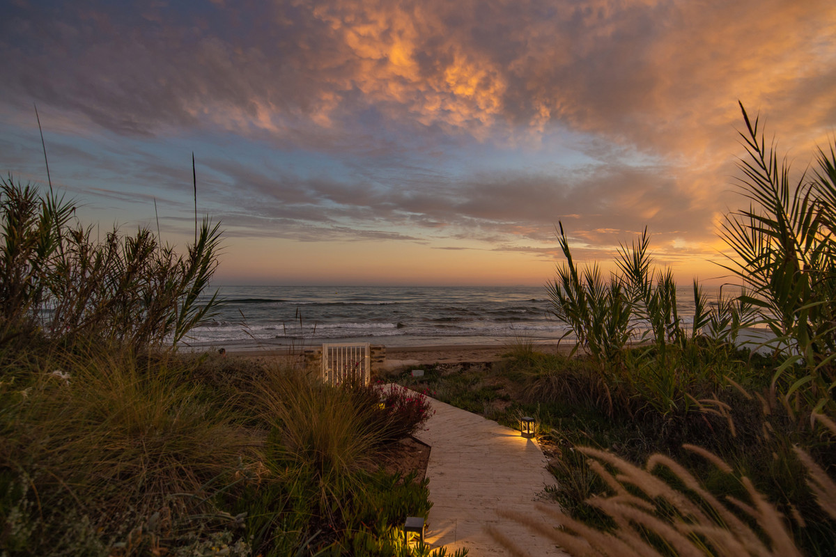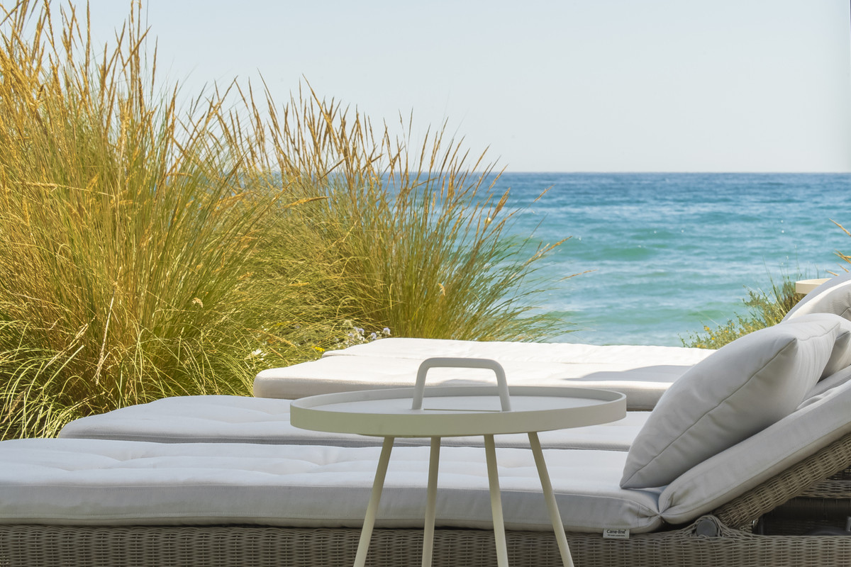 The open entrance hall connects with the large open plan kitchen and the living & dining areas and the large windows open onto the terrace and the heated pool from where you can also walk straight onto the beach.