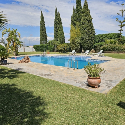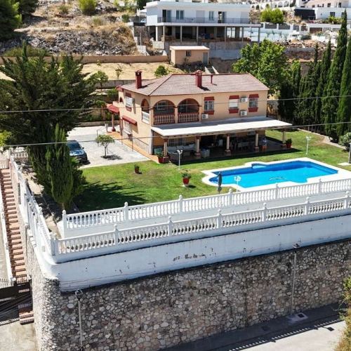 1761-V For sale. A Luxury villa of over 400m2 useful on 1010m2 of fenced plot. Consisting of living room, luxury fitted kitchen, 5 bedrooms with wardrobes, 3 bathrooms, 1 toilet and several terraces. Basement of 150m2 with lounge, wine cellar, garage, porch, pool, mature garden, automatic gates, alarm, video surveillance camera, air conditioning throughout the house cool / cold, roof terrace with spectacular sea views, the Sierra Nevada, Malaga, mount, solar panels, the house has building materials of the highest quality in the market, marble floors, doors and stairs of solid wood, double glazing, and much more, splendid house with many details, in a very desirable area, two minutes walk from schools, colleges, supermarkets, 7 min from the new motorway, 25 minutes from Malaga, the beaches and golf courses of the Costa del Sol. Very exclusive product.