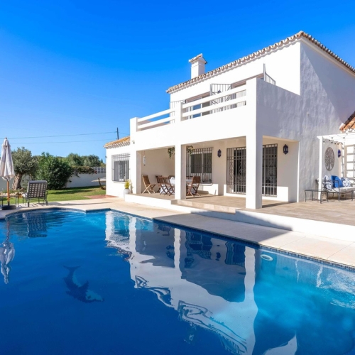Spacious beachside villa in popular San Pedro, a short drive west of Marbella and Puerto Banús, and within walking distance of the beach promenade, shops and restaurants. This house is set in manicured gardens with a swimming pool, offering a perfect combination of indoor and outdoor spaces, including a fantastic 120m2 roof terrace with panoramic views.