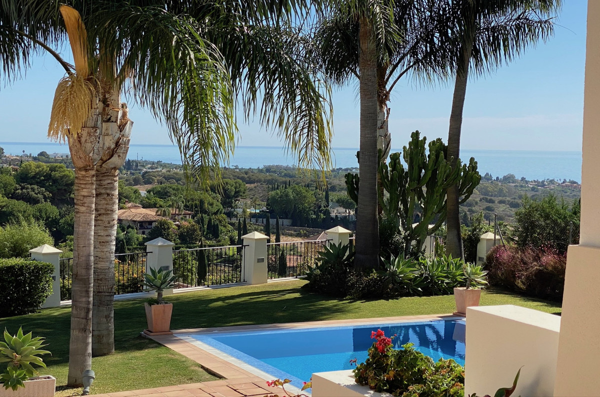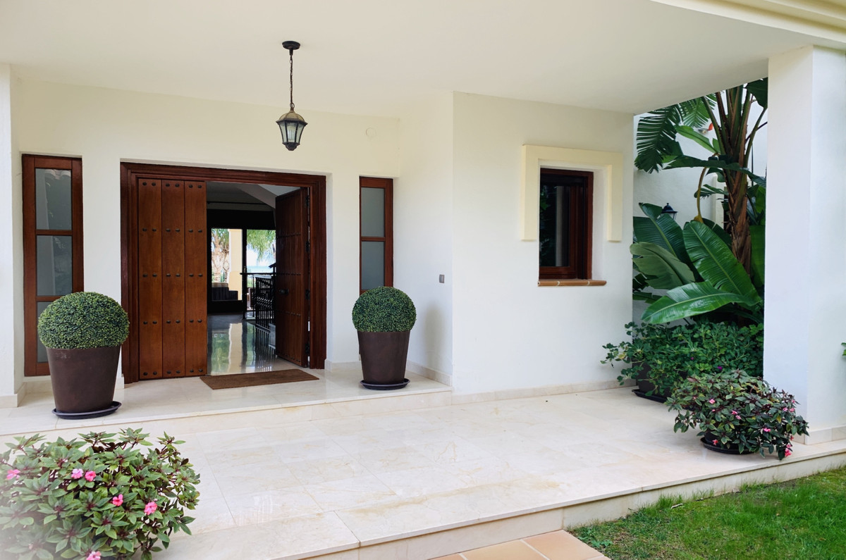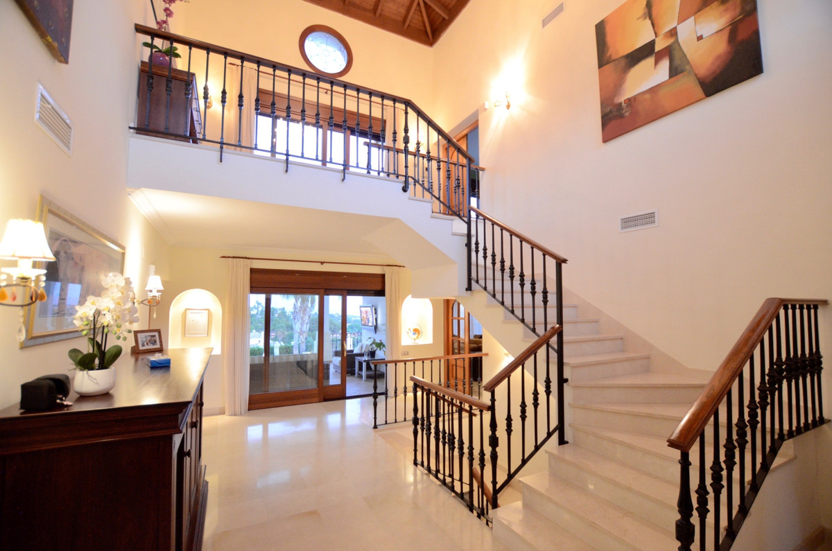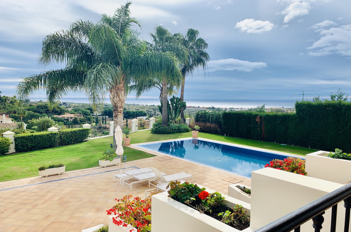 Front Line Golf Villa for Sale in Los Flamingos: A Perfect Blend of Elegance and Panoramic Views of the sea, mountains, and golf course. Prepare to be captivated by the elegant design, complemented by meticulously maintained gardens.