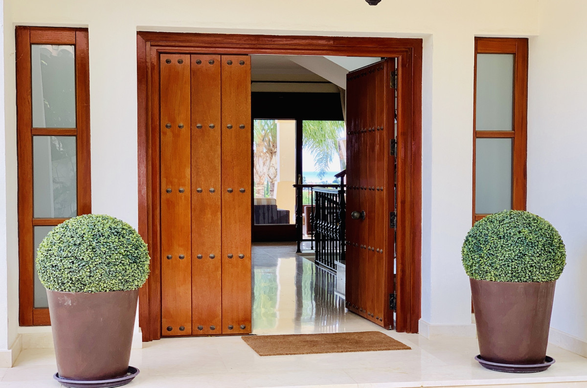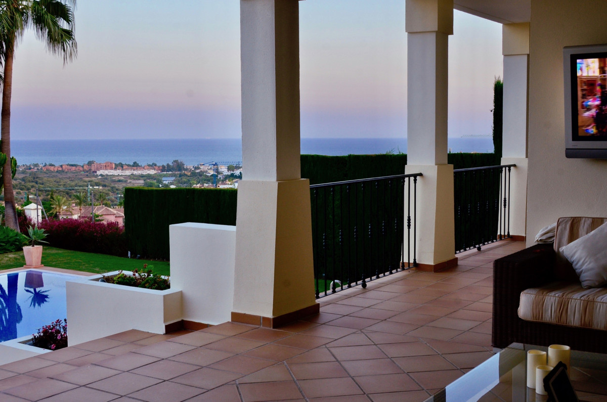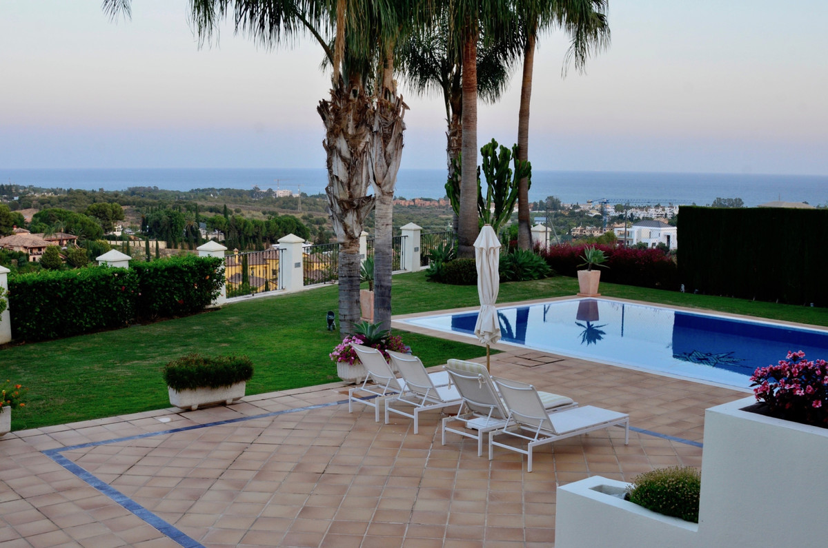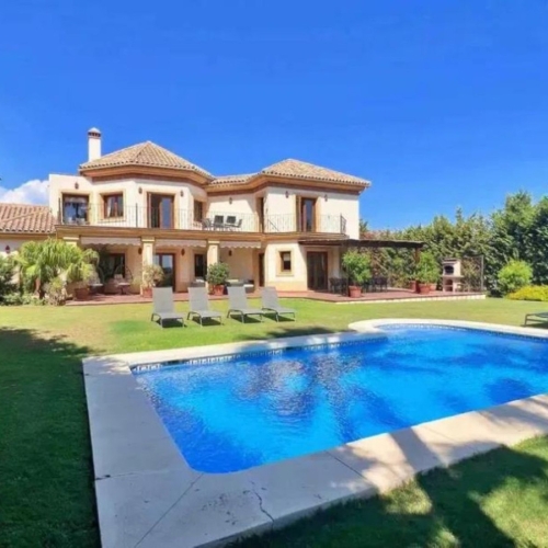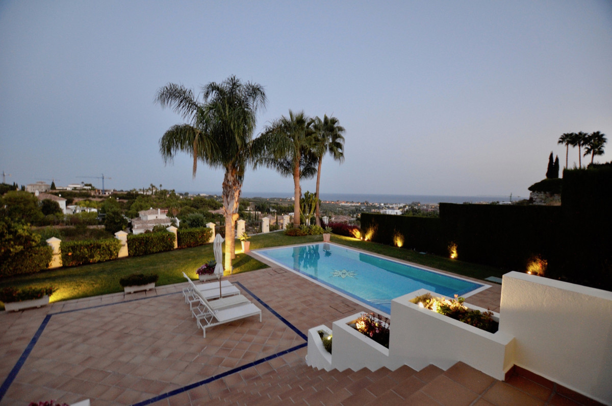 Front Line Golf Villa for Sale in Los Flamingos: A Perfect Blend of Elegance and Panoramic Views of the sea, mountains, and golf course. Prepare to be captivated by the elegant design, complemented by meticulously maintained gardens.