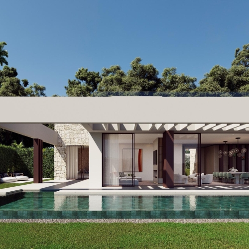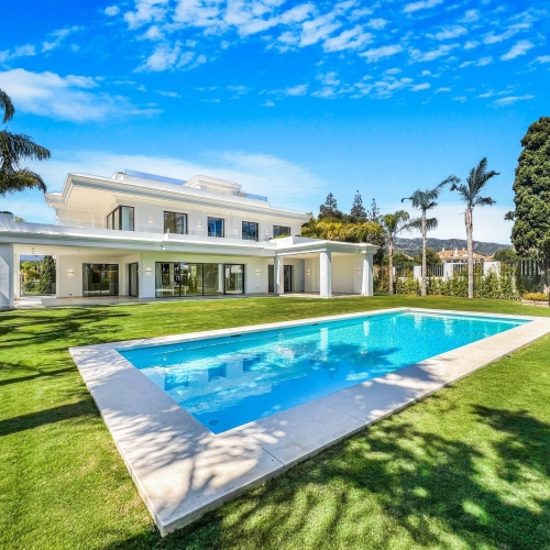 This project is a unique luxury south facing villas, which has an unbeatable location of the most prestigious area of the Golden Mile,gated community in Marbella. The development are projected by modern architecture with the idea to enjoy the views of the Mediterranean Sea and Sierra Blanca from any space of the house.The outside territory is created in the same style as the house and is its harmonious continuation. The picturesque plot of 1.850 m² has a landscaping garden, a modern swimming pool, BBQ, an outdoor parking for 3 cars. Built with high quality materials, villa has façade finished with large porcelain blocks siding with careful attention to details, including unusual architectural features and quality equipment and technology, marble and oak flooring (in the bedrooms) electric heating in whole house, an elegant lighting solution, electric shutters, innovative solutions from Schüco's Windows systems.