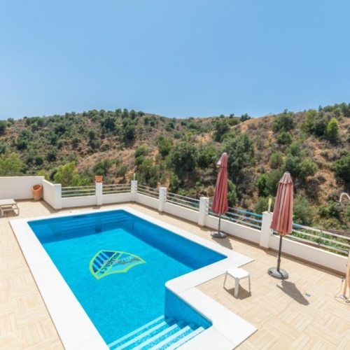 Udsigt : Bjerge, Landområde, Panoramisk, Have, Pool.