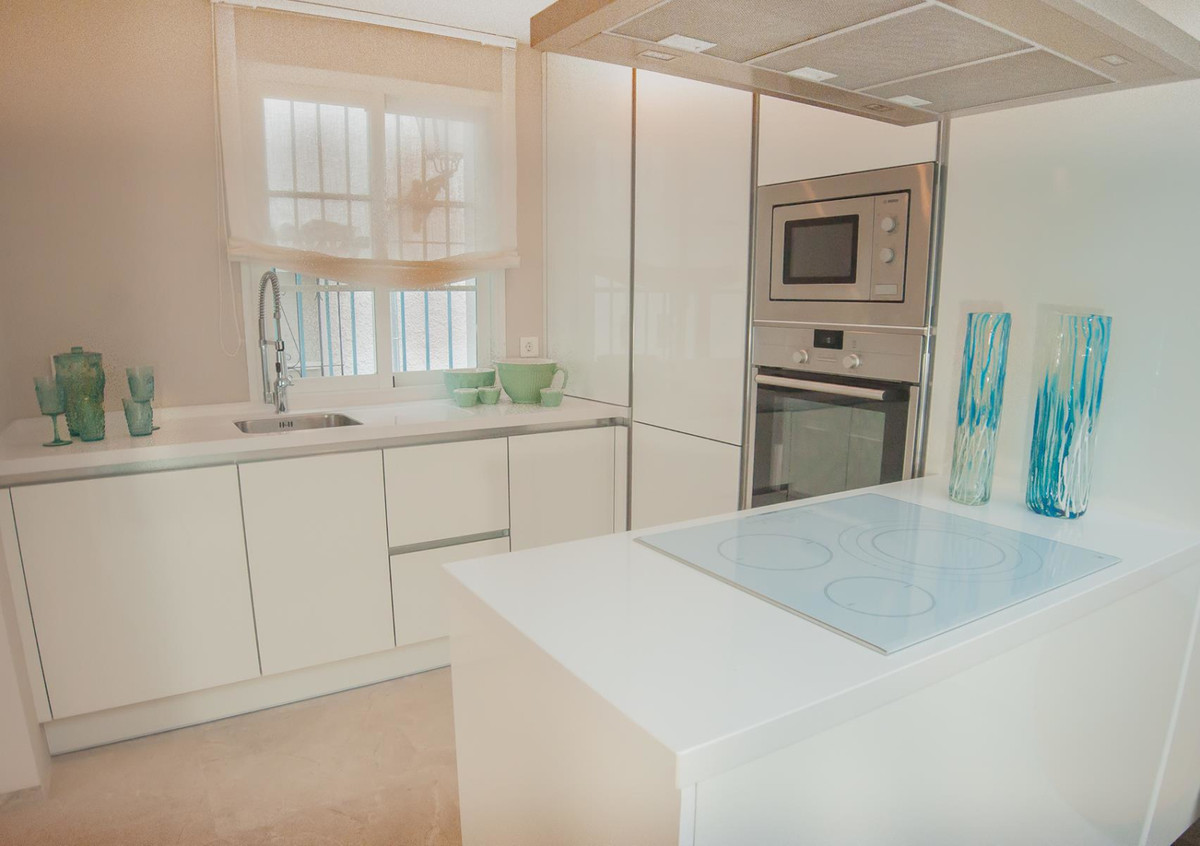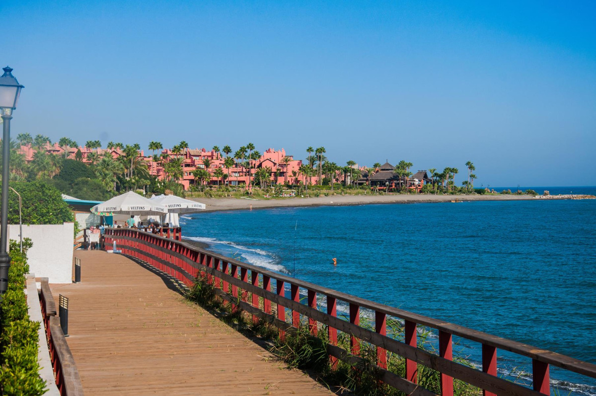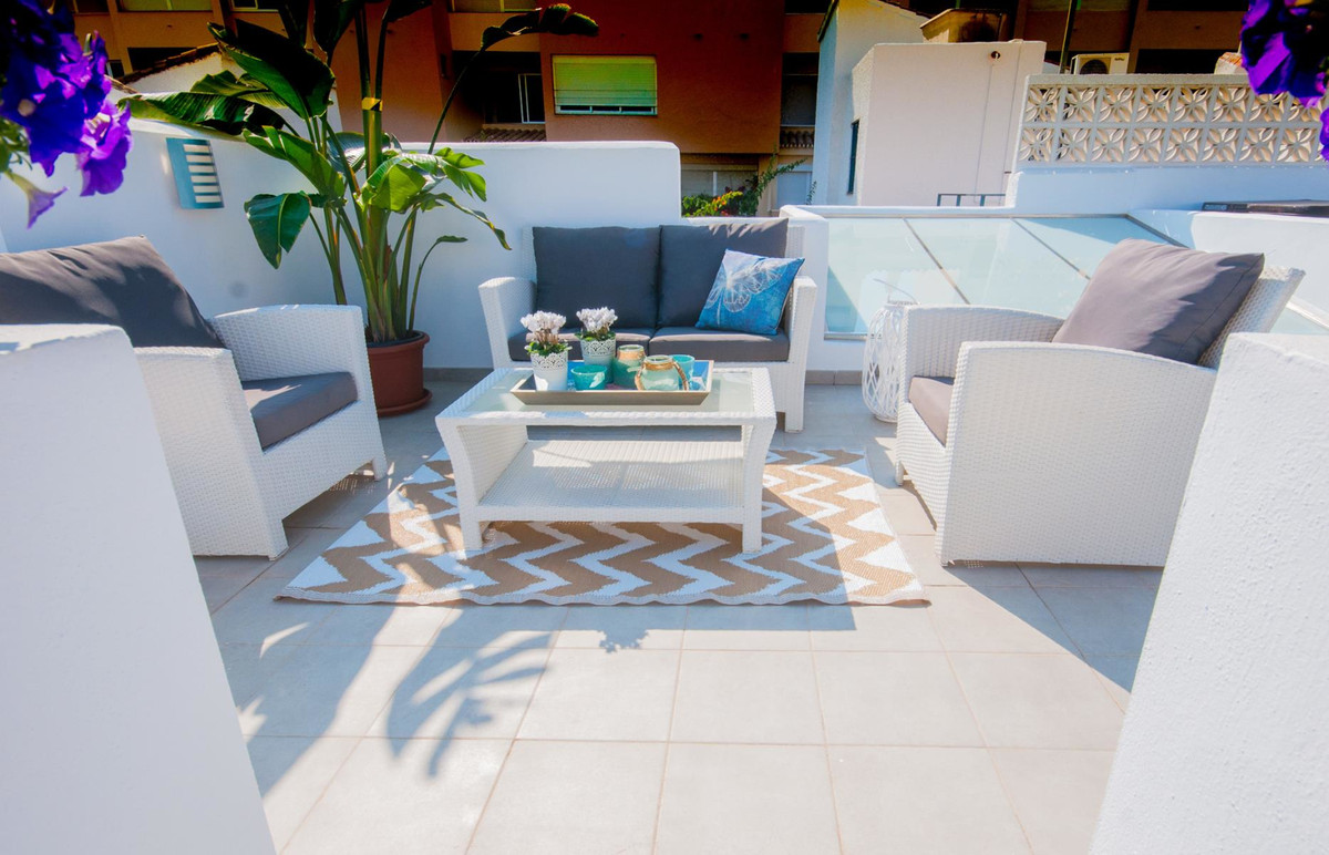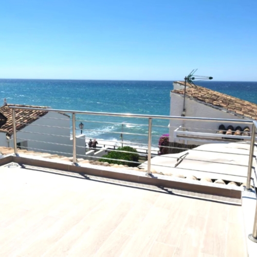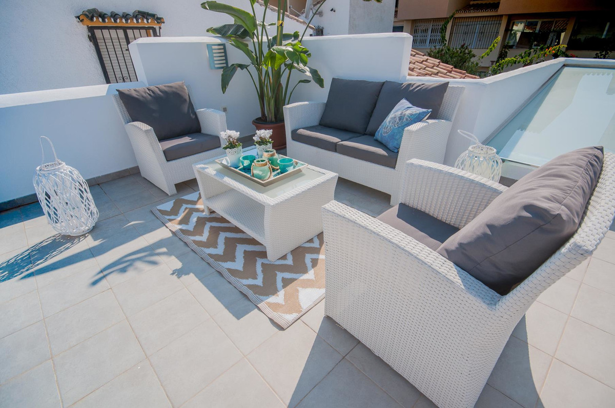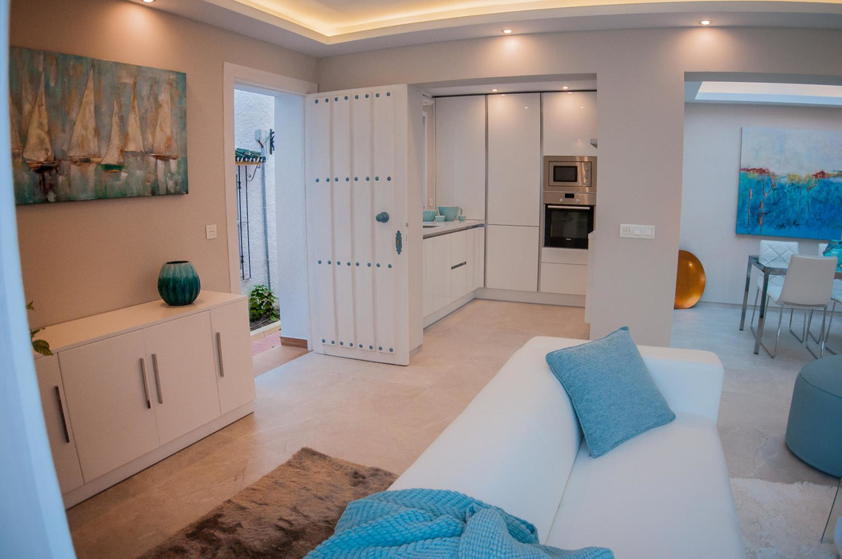Beautiful townhouse by the sea, completely renovated and redecorated with 2 bedrooms and 2 bathrooms located in the urbanization El Pirata, in Playa Bella, Estepona. The tastefully furnished living room has a dining area and an integrated kitchen with top brand appliances. There is a staircase to access a large and sunny terrace of 30m2 with all the necessary to relax, sunbathe, etc. Including a magnificent jacuzzi. All furniture is included in the price. It is located within the urbanization and only 20 meters from the beach. A promenade in front of the urbanization connects with several beach bars and restaurants and offers an area to walk or practice unrivaled running, in a few months will be connected by this promeade with Estepona. You have to see it, it's gorgeous