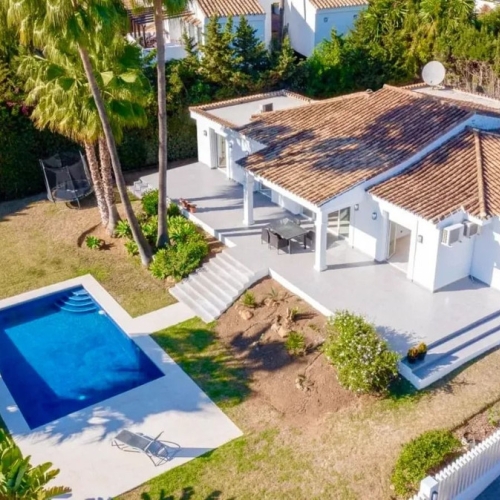 Cozy independent Andalusian style villa in Atalaya, Estepona, close to all services and golf courses. The villa is divided into two parts and each of them has its independent access and entrance. In the first part there are two floors. The ground floor includes a lobby, living room with fireplace, dining room, large kitchen that has access to the inner courtyard, two rooms with their bathrooms and a toilet. First floor: master bedroom suite with large bathtub, dressing room and access to the terrace with beautiful views of the sea and the garden. The other part of the house has the same distribution but there is one more bedroom. The property is located on the plot of more than 3000 square meters, has a very nice garden with fruit trees.