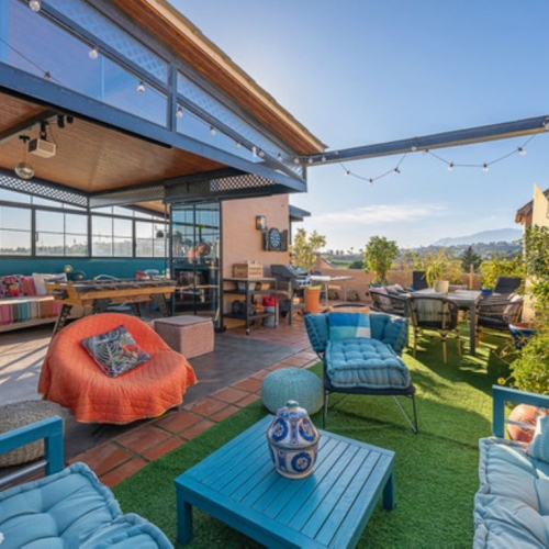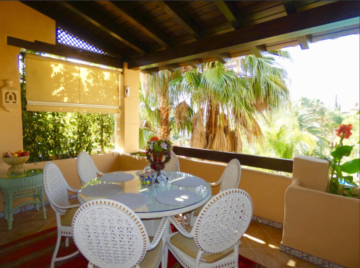 This terrace is south facing with fantastic views to the sea, the mountains and the communal gardens and pool, dining room and kitchen with barbecue.