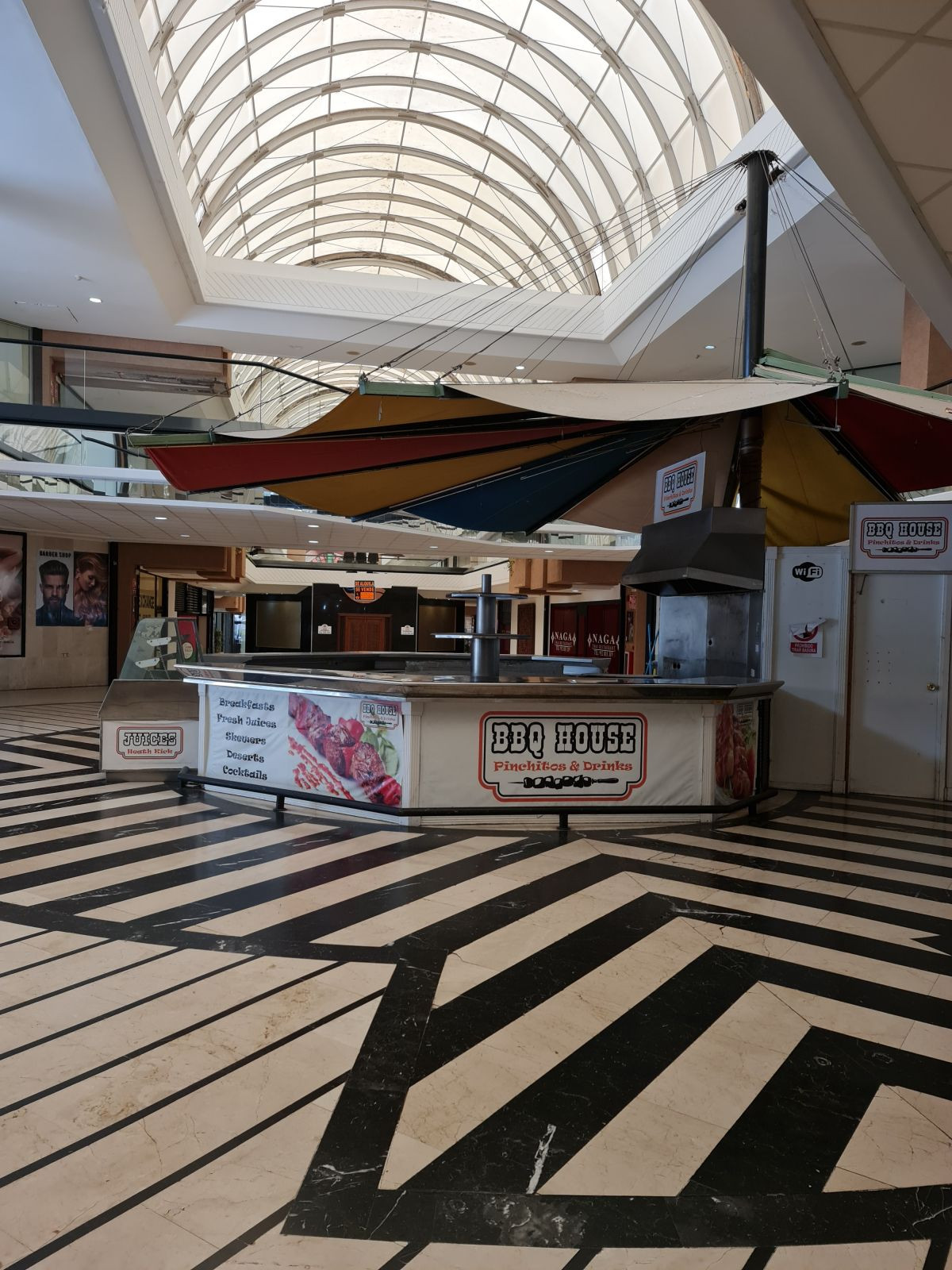 All kinds of businesses in the Shopping Center, elevator, garages, etc.