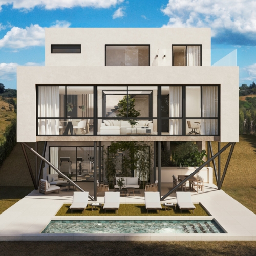 Villaen står på en 1474m² grund. Dens høje placering giver fuldstændig privatliv og panoramaudsigt over La Cala de Mijas' grønne bakker og Middelhavet. Perfekt sydvendt, den har 3 etager, 5 soveværelser og 4 badeværelser. Åbne indre rum med store vinduer fører til terrasser designet til sol eller skygge året rundt.