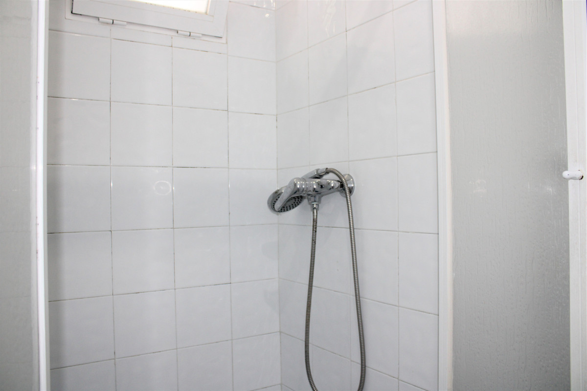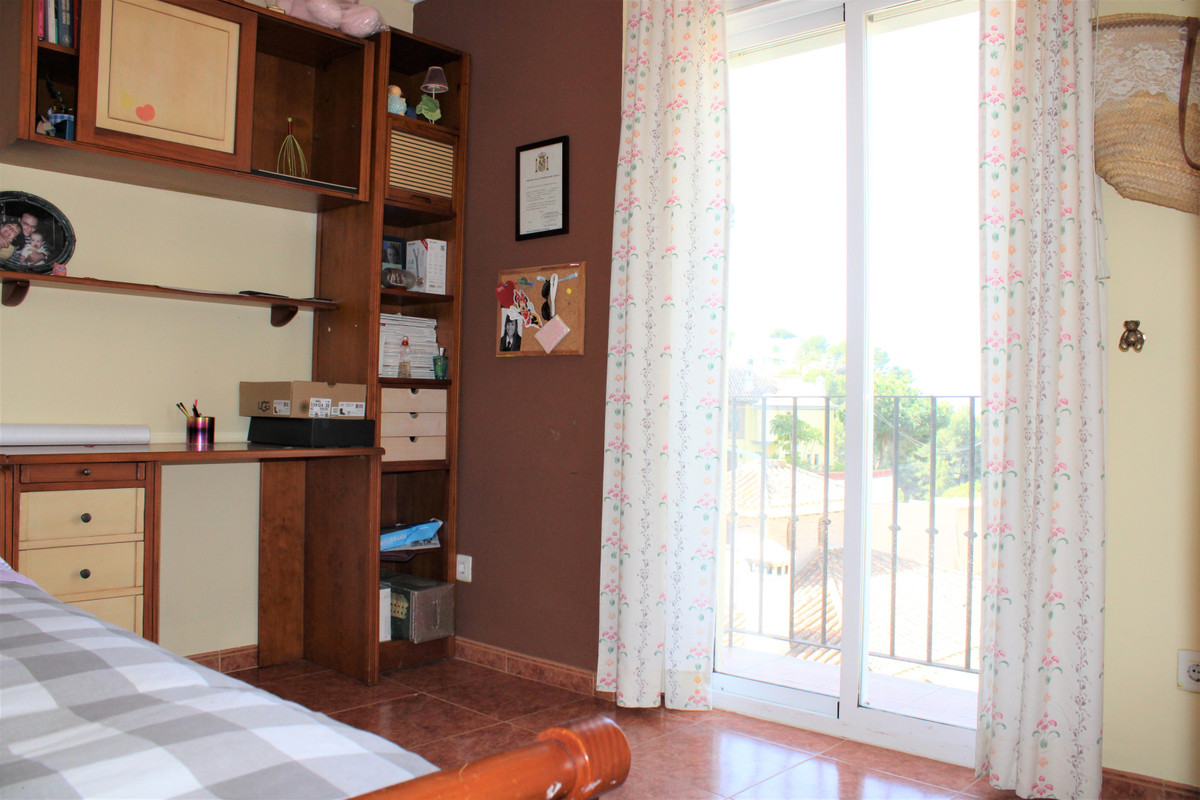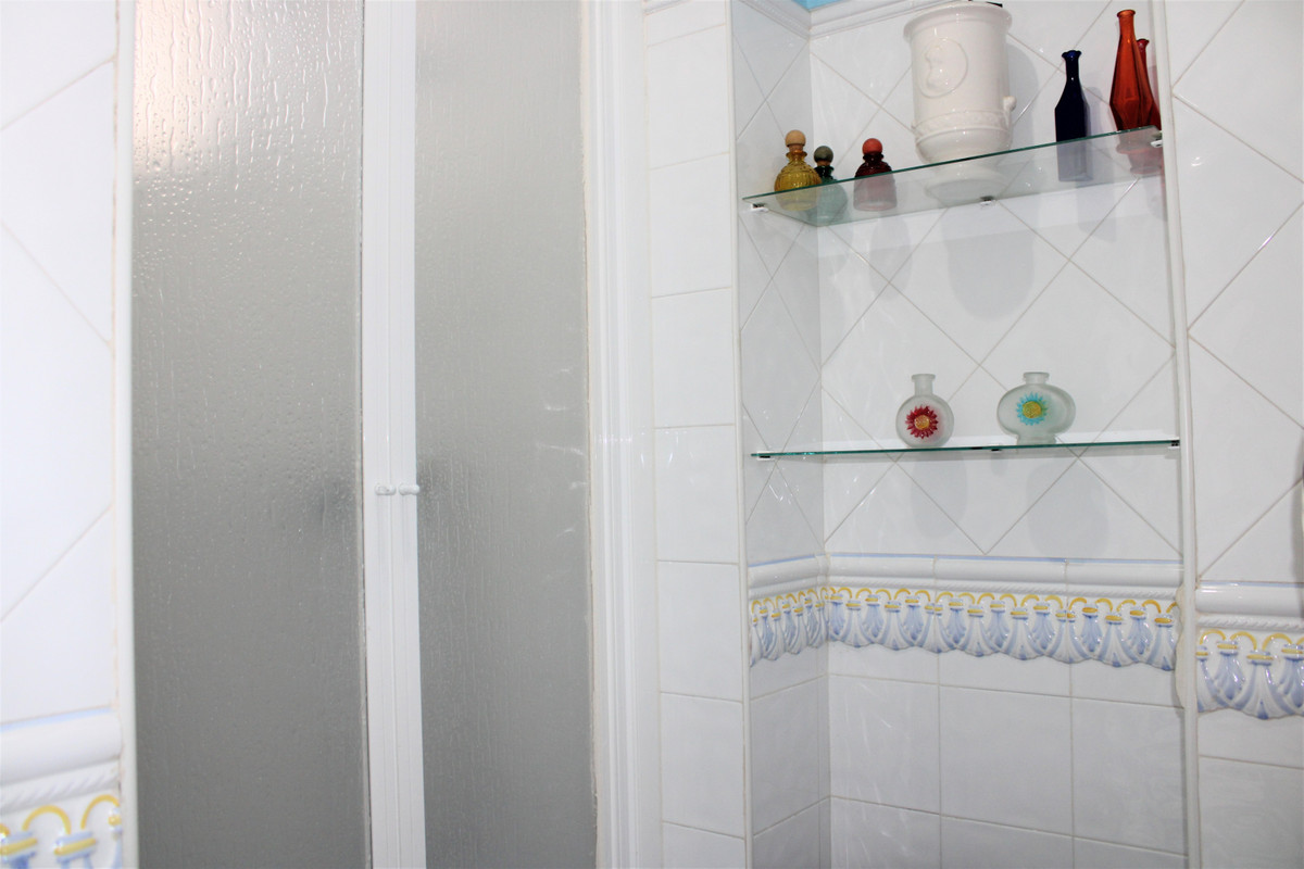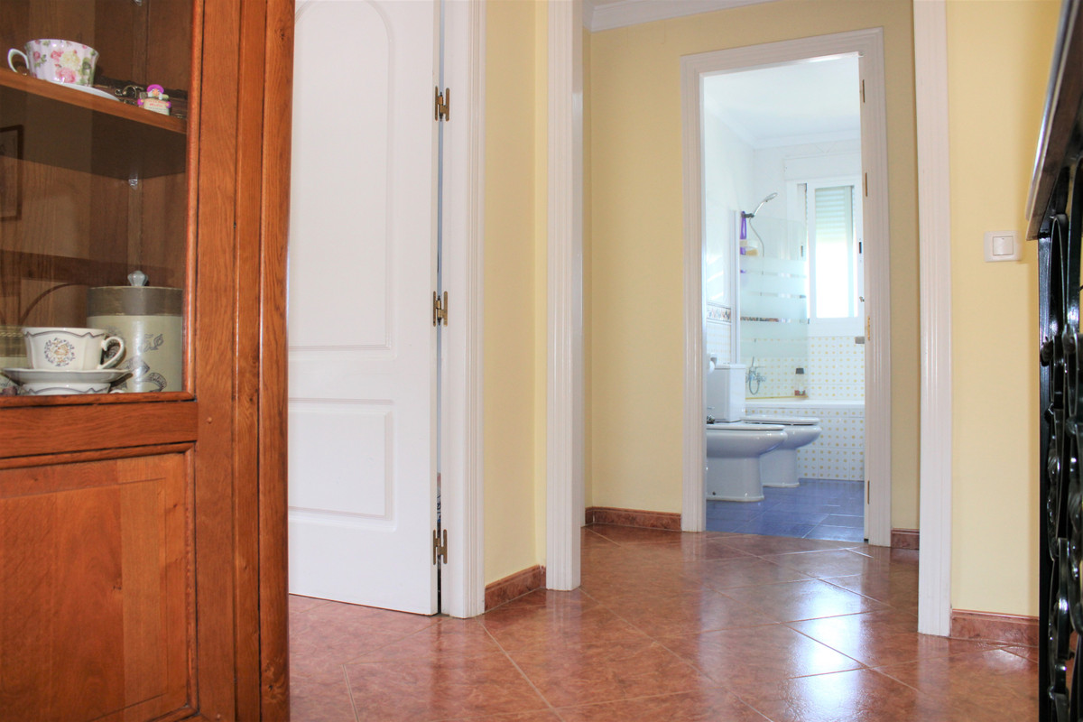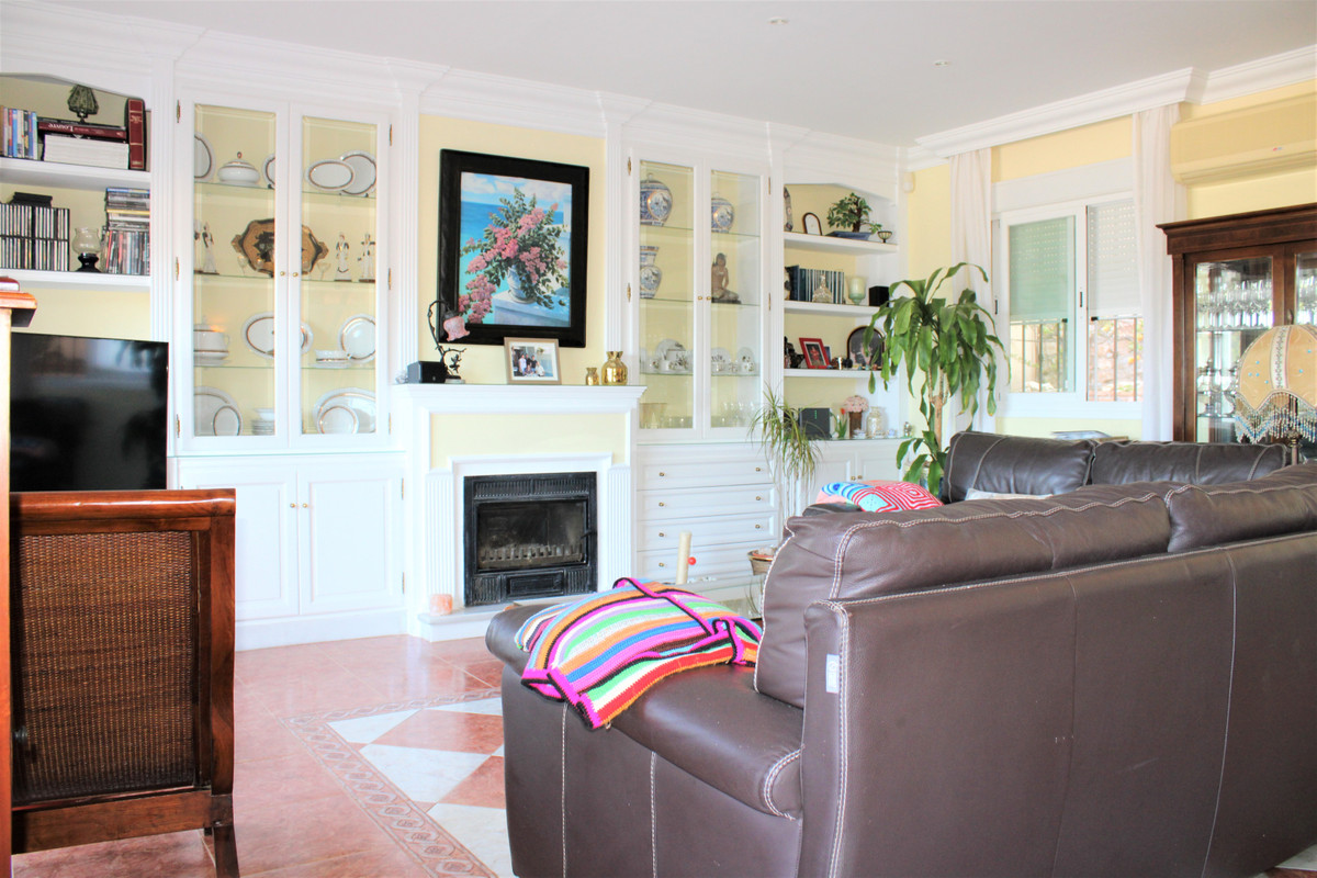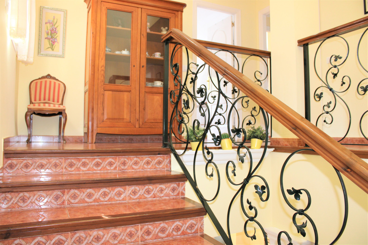 Direkte inden for døren i stueplan har du det første soveværelse, som i dag bruges som kontor. Der er også et toilet sammen med flere skabe. På samme side inden trappen op til øverste etage, er vaskerummet med adgang til terrassen på bagsiden. I vaskerummet er der også en vandvarmer, der drives af solpaneler på taget. Overfor vaskerummet er et fuldt udstyret køkken med spiseplads, her er der også udgang til den dejlige terrasse, der omgiver huset. Vi går videre til en stor lys stue med glasdøre, der fører ud til terrassen, hvor du har en muret grill og en rigtig udendørs ovn. Et vidunderligt sted at lave mad og have socialt samvær på de lune aftener.