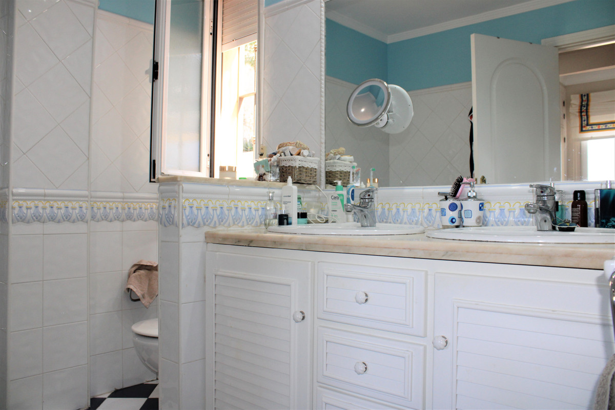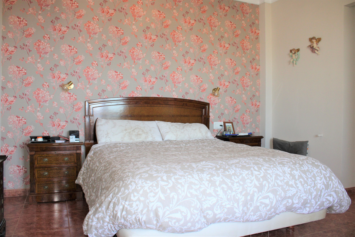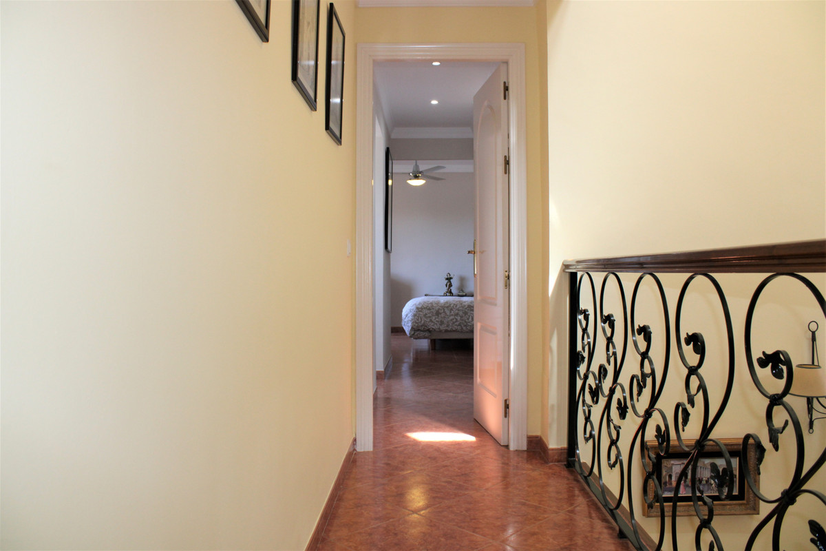 Vi tager trappen op til øverste etage, hvor vi har yderligere fire soveværelser og to badeværelser. Der er også et lyst og flot "walk-in closet". De første tre soveværelser deler det første badeværelse og det fjerde soveværelse er mastersoveværelse og har sit eget badeværelse. Master soveværelset har også adgang til sin egen terrasse med en dejlig udsigt over havet og bjergene.