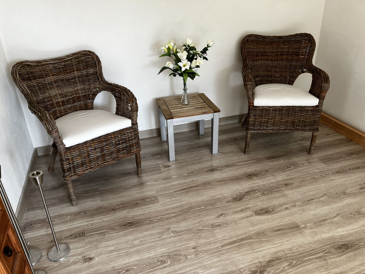 * Indvendige Detaljer: Køkkenet og badeværelset har flisegulv, mens stuen har trægulv. Den overdækkede terrasse og huset sammen er på 50 kvm.