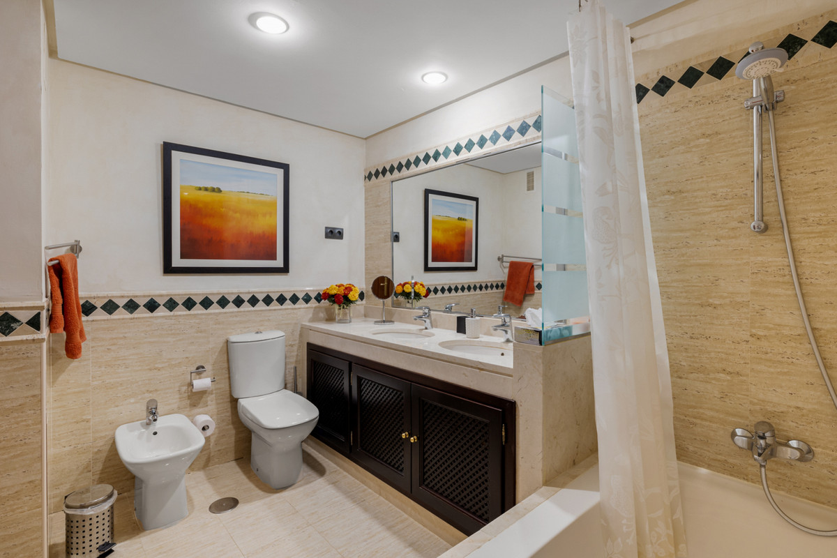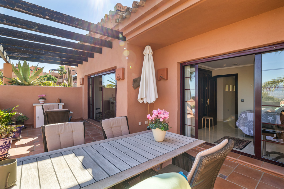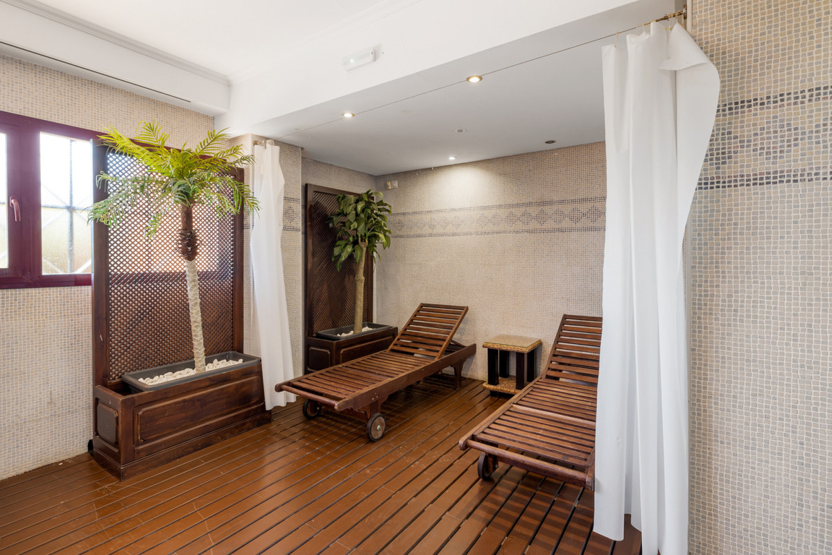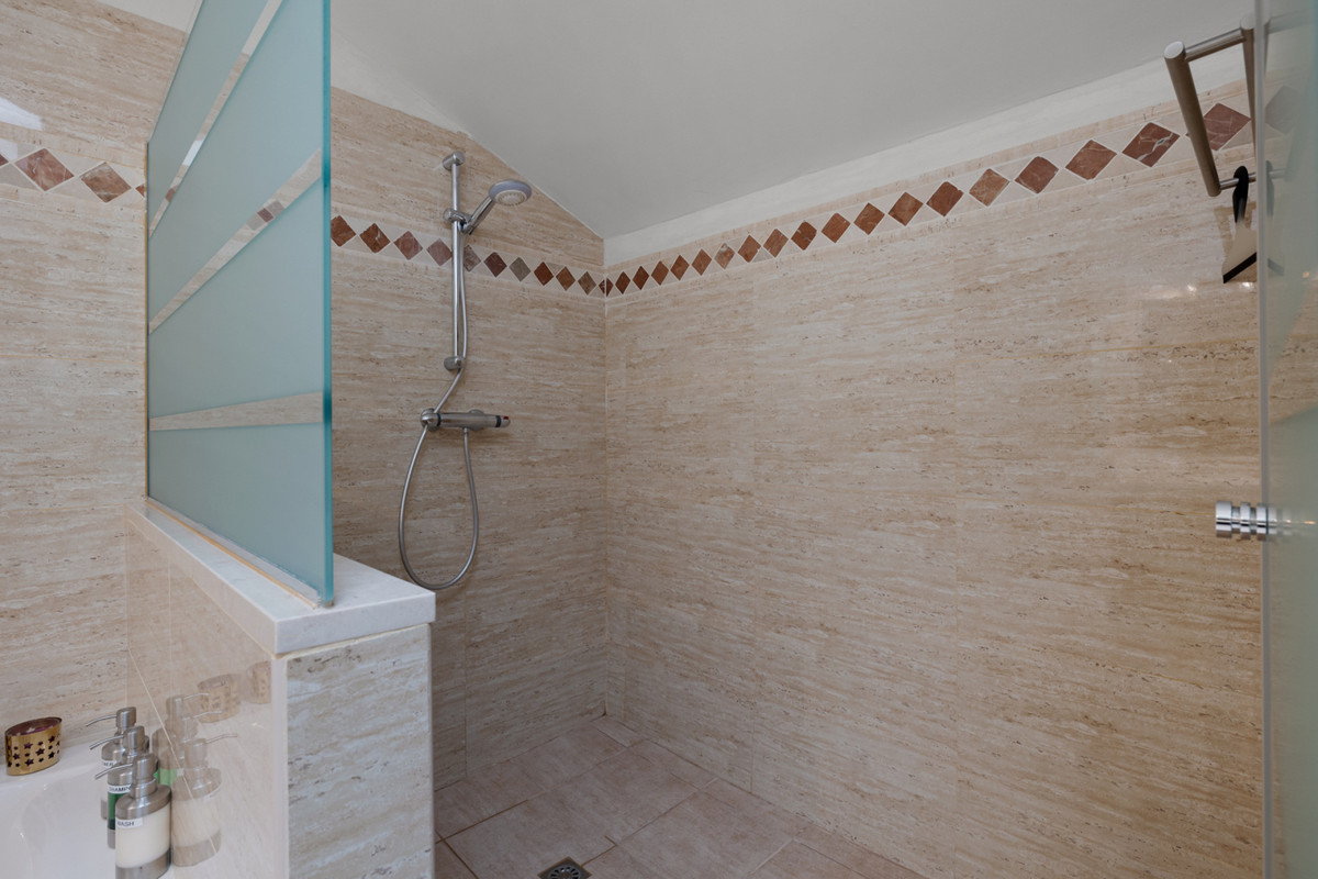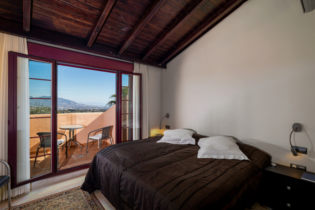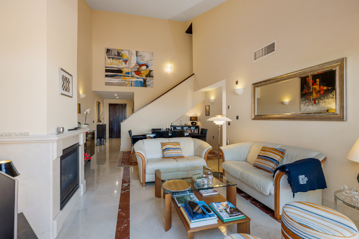 Fra stuen med højt til loftet er der direkte adgang ud til boligens største terrasse, hvorfra du har udsigt til den spektakulære Mijas Sierra-bjergkæde. Det er en af de mest fantastiske udsigter på kysten! Lejligheden er en duplex lejlighed og på stueplan finder du stue, spiseplads og hovedterrasse; køkken og bryggers; to soveværelser, et familiebadeværelse og en anden terrasse, som har udsigt til poolområdet og den tropiske have. Hele den øverste etage er en master suite komplet med påklædningsområde, ensuite badeværelse og privat terrasse.