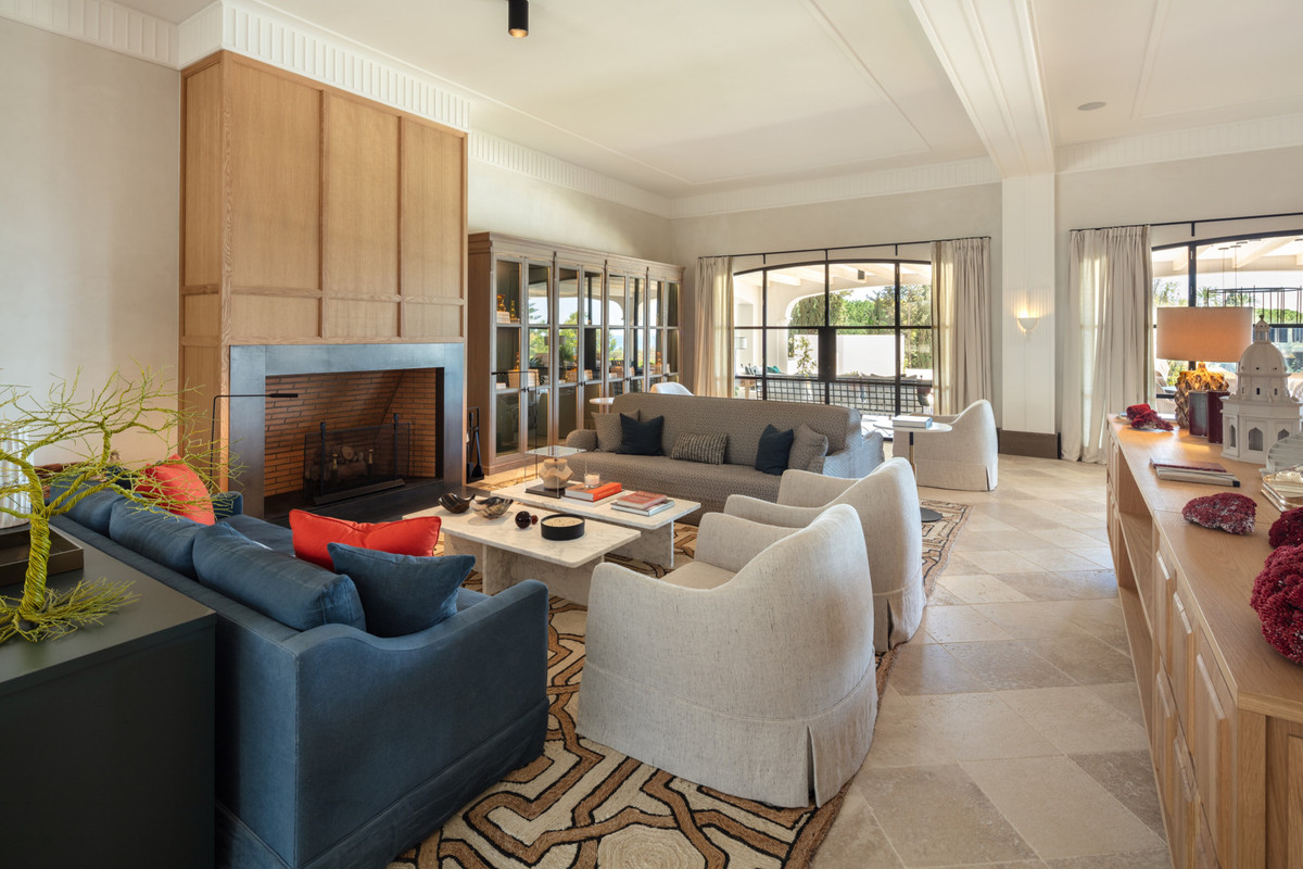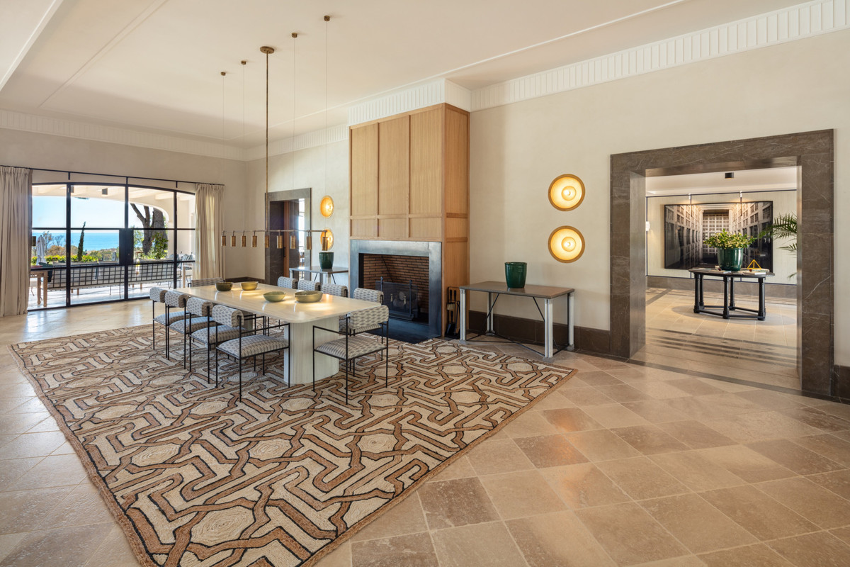 Designed by respected Spanish interior designer Luisa Olazábal, the property promotes an eclectic and timeless style, each corner of the premise being thoughtfully curated. This truly impressive villa opens up to a stunning grand salon with multiple lounge spaces built within a sunken area, each section staying true to its eccentric style, with an impressionable brass centre chandelier. You can also find a separate dining area with opposing dual open steal fireplaces with wooden clades.
