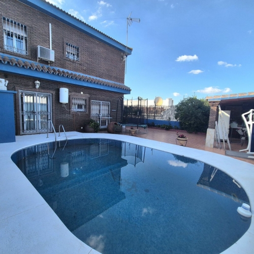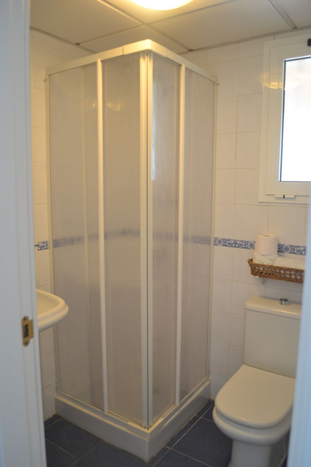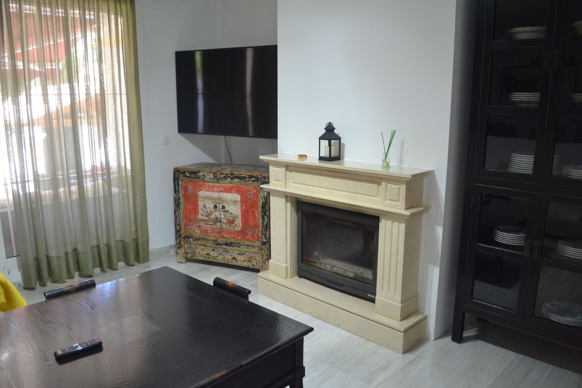 You enter the property via the garage door or pederstrian gate, you have a covered parking space aswell as roadside parking. You go up some stairs to the main level where the property and terraces are located. You have a large front terrace that is easy maintenance with a covered terrace with nice seating area and a hot tub with nice views. The property is set over two floors, as you enter to the left you have a full bathroom, stairs up to the 2nd level and a storage room. In front of you is the big kitchen, fully equiped with a door that can access the back covered terrace and garden area. From the hallway to the right you have a large living / dining room with fireplace and air conditioning. Upstairs straight in front of you, you have the master bedroom with air conditioning, fitted wardrobes, terrace and ensuite bathroom and to the left you have the other 2 bedrooms with fitted wardobes and a bathroom to share.
