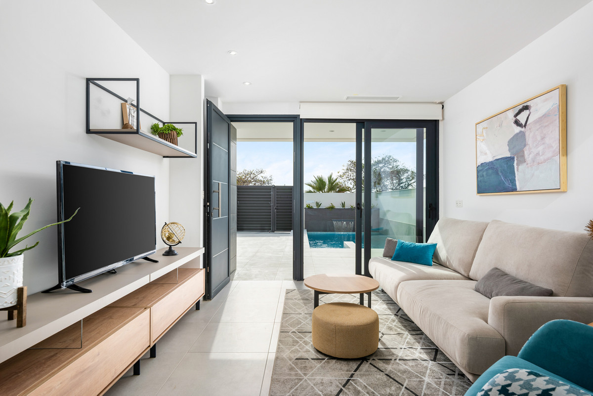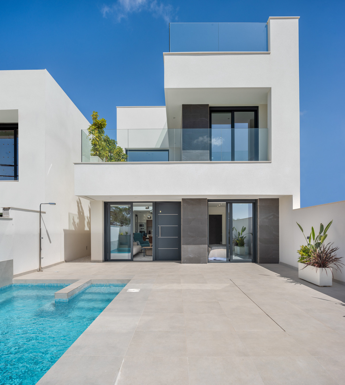 The residential consists of 10 modern style Villas in private plots with terrace, parking area and private pool. They comprise a living room area, fitted kitchen, 3 bedrooms, 2 bathrooms and a double height with great views. All villas have optional solarium and some of them basement. Carefully designed with high quality materials to satisfy the needs of the most demanding clients.