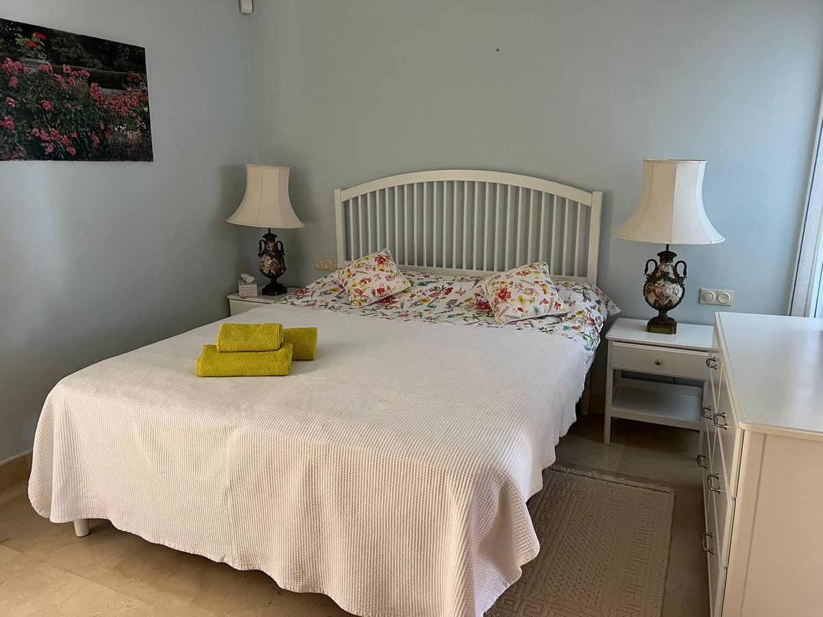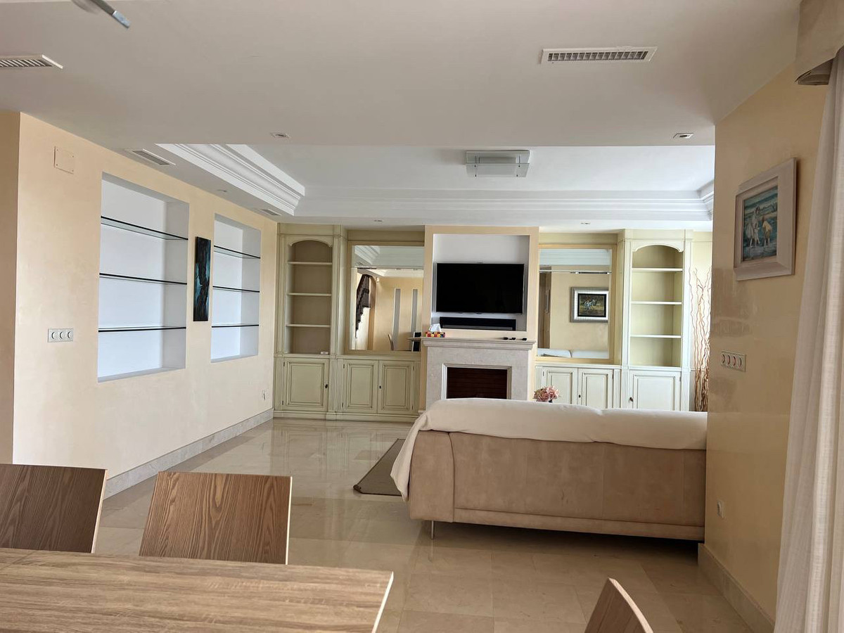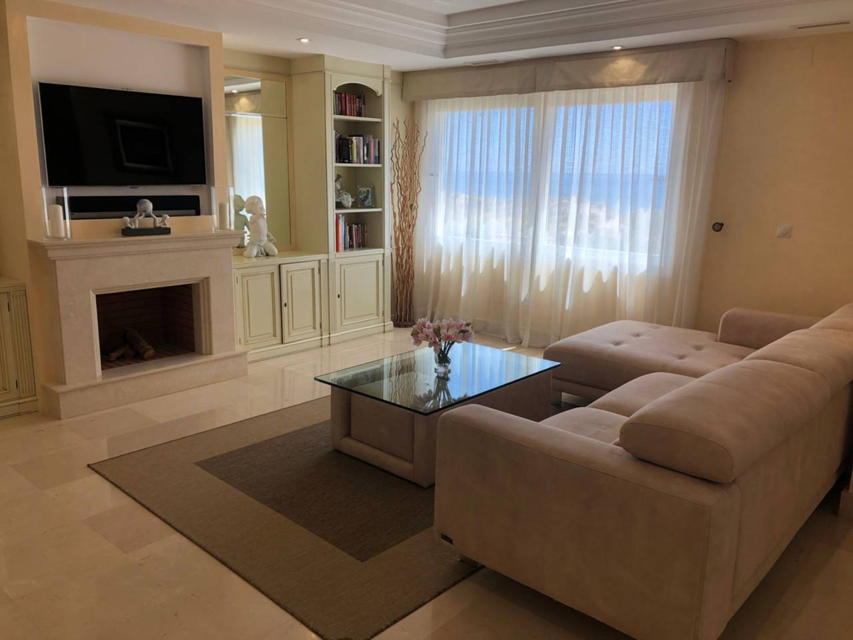 House for sale and for rent in Arenas de Bahia Marbella, Marbella with 4 bedrooms, 5 bathrooms, 4 en suite bathrooms and with orientation south, with communal swimming pool, private garage (2 parking spaces) and communal garden. Regarding property dimensions, it has 329 m² built, 350 m² plot, 229 m² interior and 100 m² terrace. Has the following facilities front line beach, amenities near, transport near, air conditioning, fully furnished, fully fitted kitchen, utility room, fireplace, marble floors, storage room, alarm, solarium, security entrance, dining room, barbeque, security service 24h, telephone, guest toilet, private terrace, kitchen equipped, living room, sea view, mountain view, laundry room, internet - wifi, covered terrace, 24h service, electric blinds, fitted wardrobes, gated community, garden view, pool view, panoramic view, beachside, doorman, underfloor heating (partial), close to sea / beach, close to golf, excellent condition, close to shops, close to town, close to schools, surveillance cameras, individual a/c units, ground floor patio, aerothermics and internet - fibre optic.