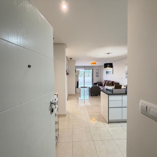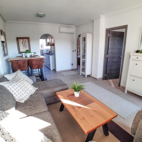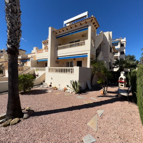 This property is a ground floor apartment with added extras such as a glazed in front terrace and a covered utility room and back yard and a nice tiled front garden. Inside the apartment the lounge is tastefully decorated and there are 2 bedrooms with fitted wardrobes plus a family bathroom. There is use of a good sized communal pool to help you relax in the sun.