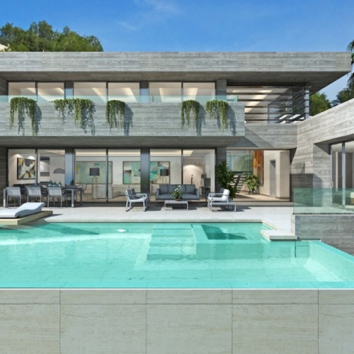 A large property of 492 m2 built, of which 130m2 are terraces, it has four levels and delivers panoramic views to the sea. Outside, there is a garden with mature palm trees, grass areas and swimming pool. Plenty of terrace areas to enjoy the Mediterranean climate also and plenty of large windows to flood the property with light.