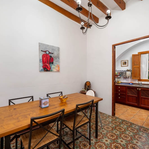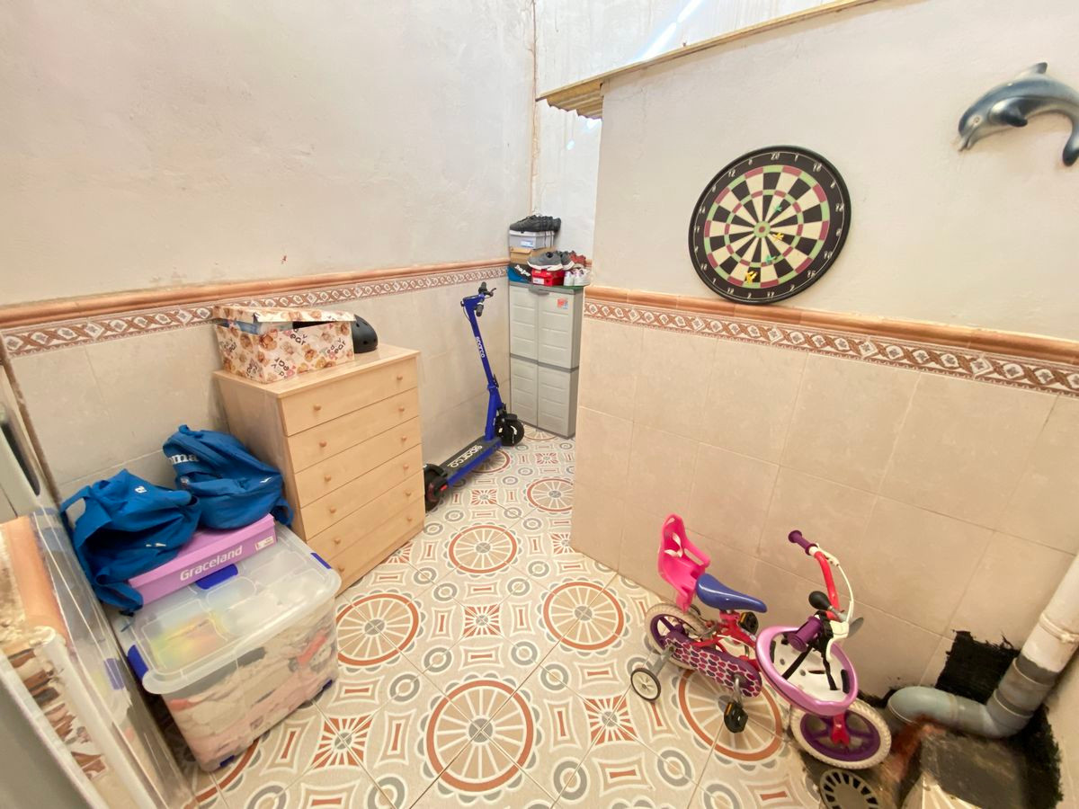 Spacious three bedroom townhouse all on one level in the great location of Los Palacios, Formentera del Segura on the Costa Blanca South. As you enter the property you have a large spacious living come dining area with log fire, the hallway with pellet burner leads to three double bedrooms, plus a study which could be used as a bedroom.  Separate kitchen, family bathroom and en-suite off the master bedroom, this property has a build size of 115 m2. From the study you have internal access to the underground private storage room and private garage of 63 m2 with own toilet. You have internal spiral stairs from rear courtyard up to the private solarium with brick barbeque area and room for sunbathing.