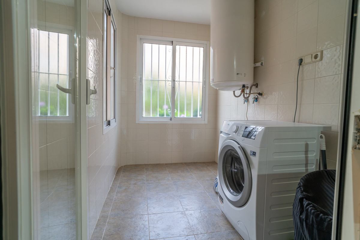 The kitchen is fully equipped with all appliances such as oven, dishwasher, coffee maker, toaster, microwave, ceramic hob and fridge. The laundry room is separated with a washing machine and a rack to hang clothes.