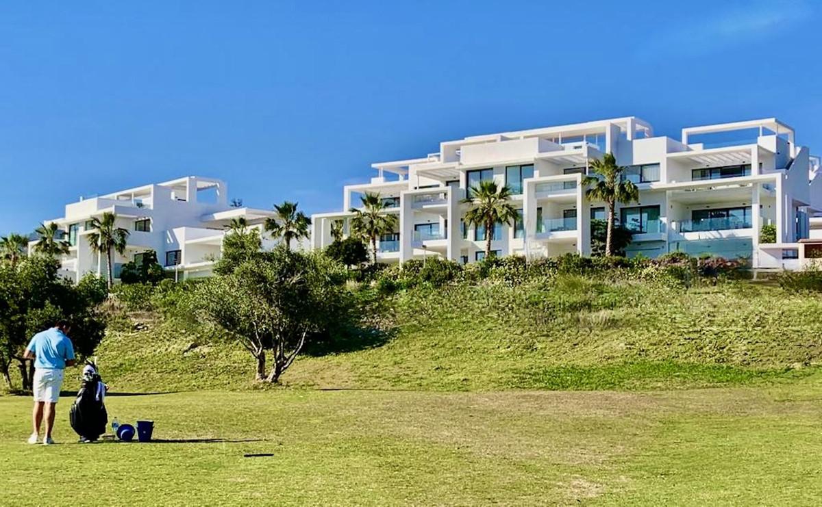Den elegante master-suite har et rummeligt indbygget klædeskab og et luksuriøst badeværelse designet af Porcelanosa med et afslappende massagebad. Den lyse stue imponerer med højt til loftet og store skydedøre fra gulv til loft, der fører ud til den generøse 28 m² store sydvendte terrasse, der er ideel til underholdning eller afslapning med fredfyldt udsigt over golfbanen og haven. Denne 102 m² store lejlighed er bygget med termisk og akustisk isolering i topklasse og sikrer ultimativ komfort året rundt.