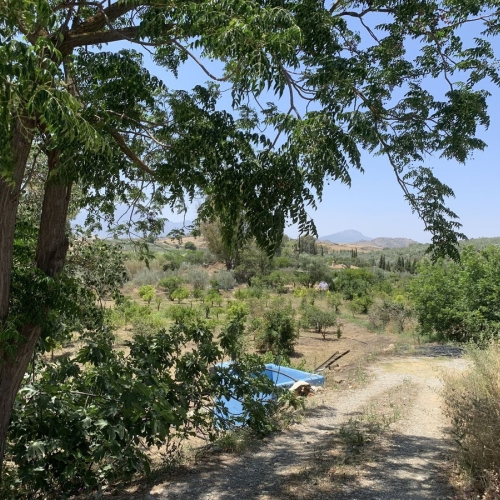 The easily accessible fenced plot has large flat areas next to the lane then slopes down the valley. It's primarily full of olive trees and a small fruit orchard.