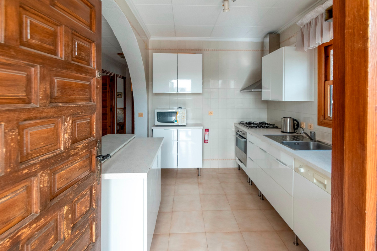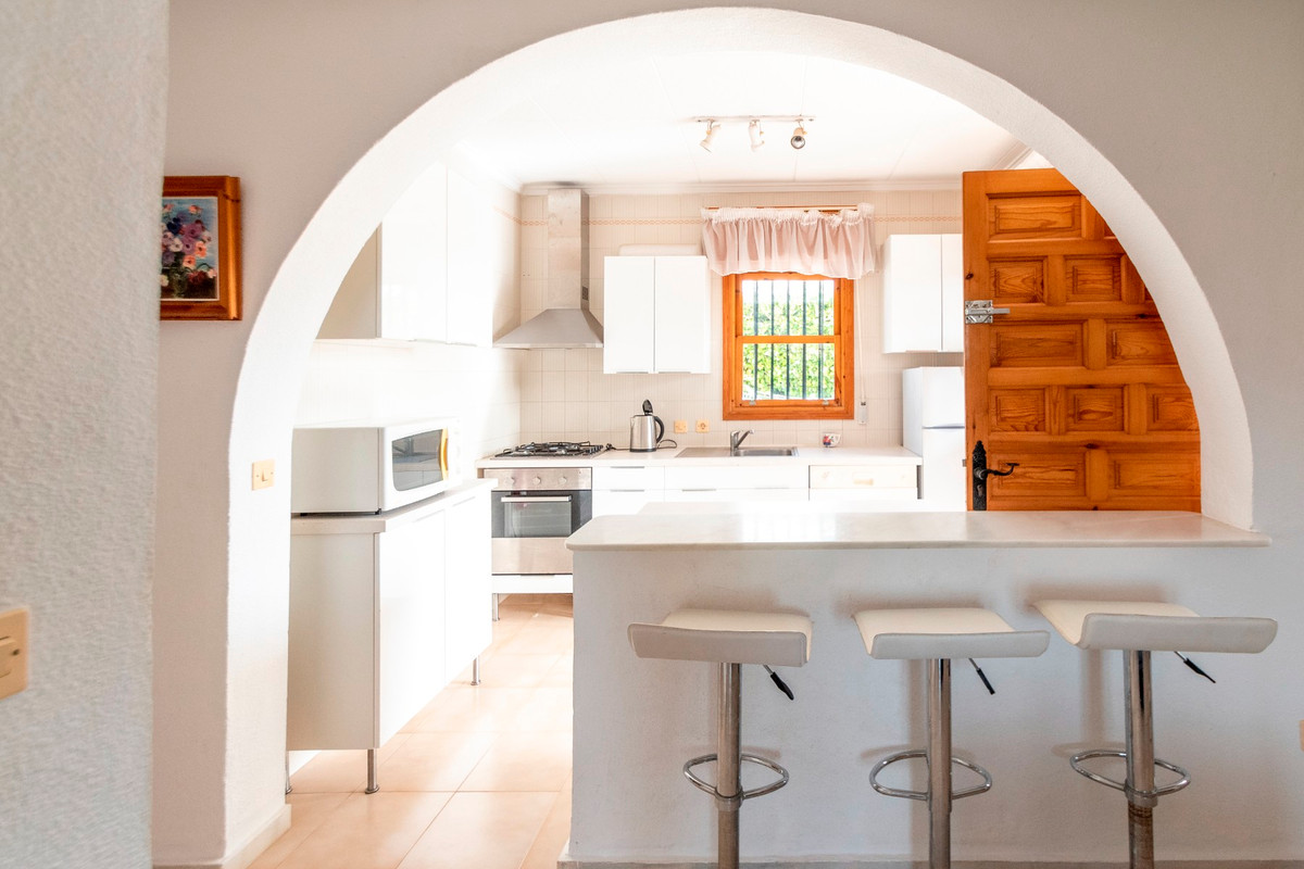From the hall, we can access the open-style kitchen-living room, which is a bright and pleasant space, with direct access to the terrace that offers views of the pool, which guarantees a large amount of natural light and spectacular sunsets. The kitchen is fully equipped with appliances and has a breakfast bar that allows a comfortable and functional flow of traffic between the living room and the kitchen.\n