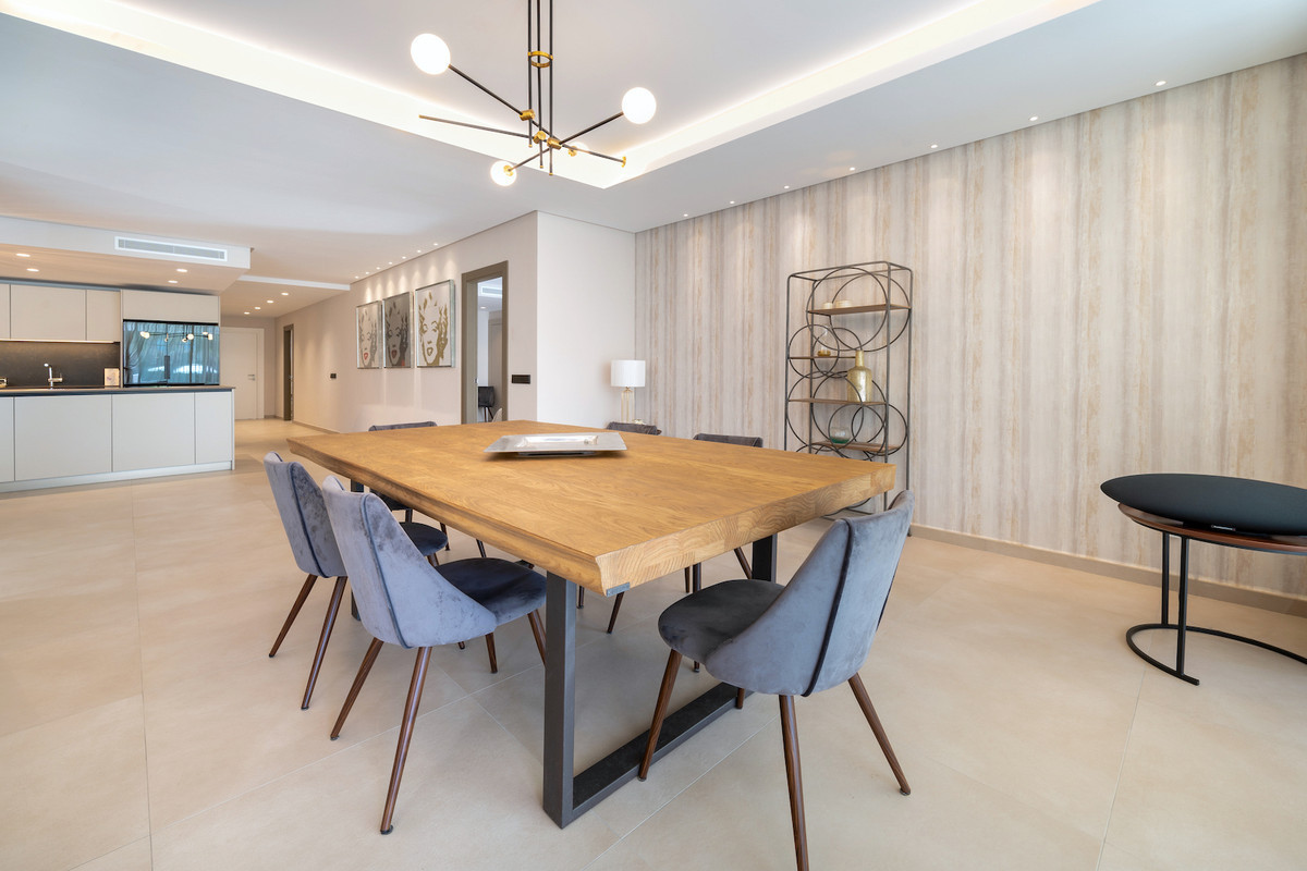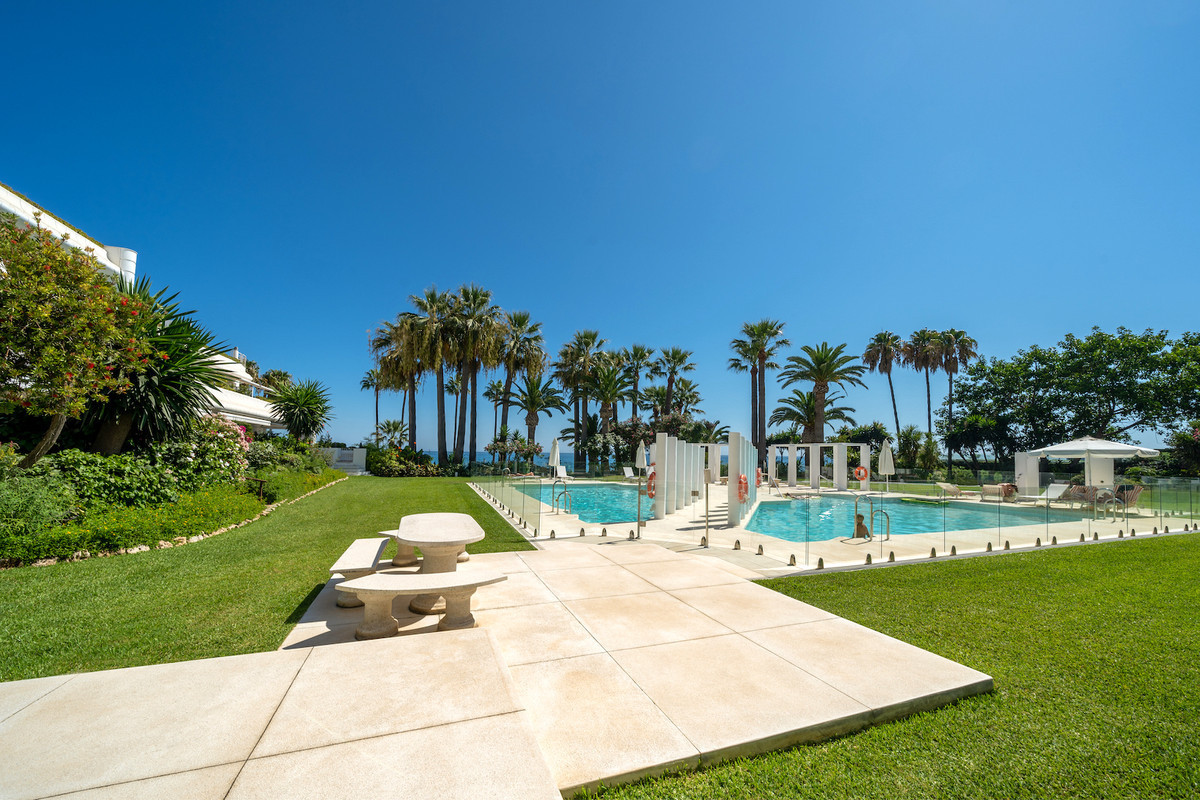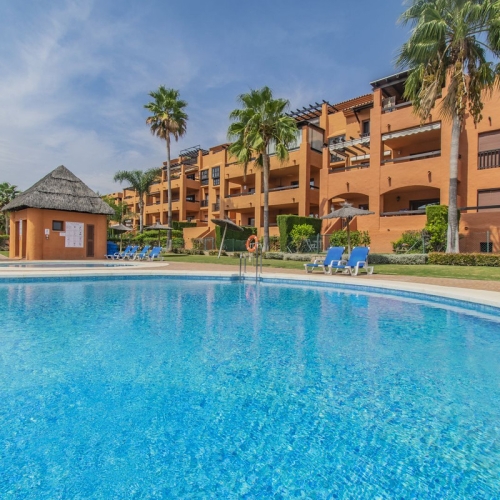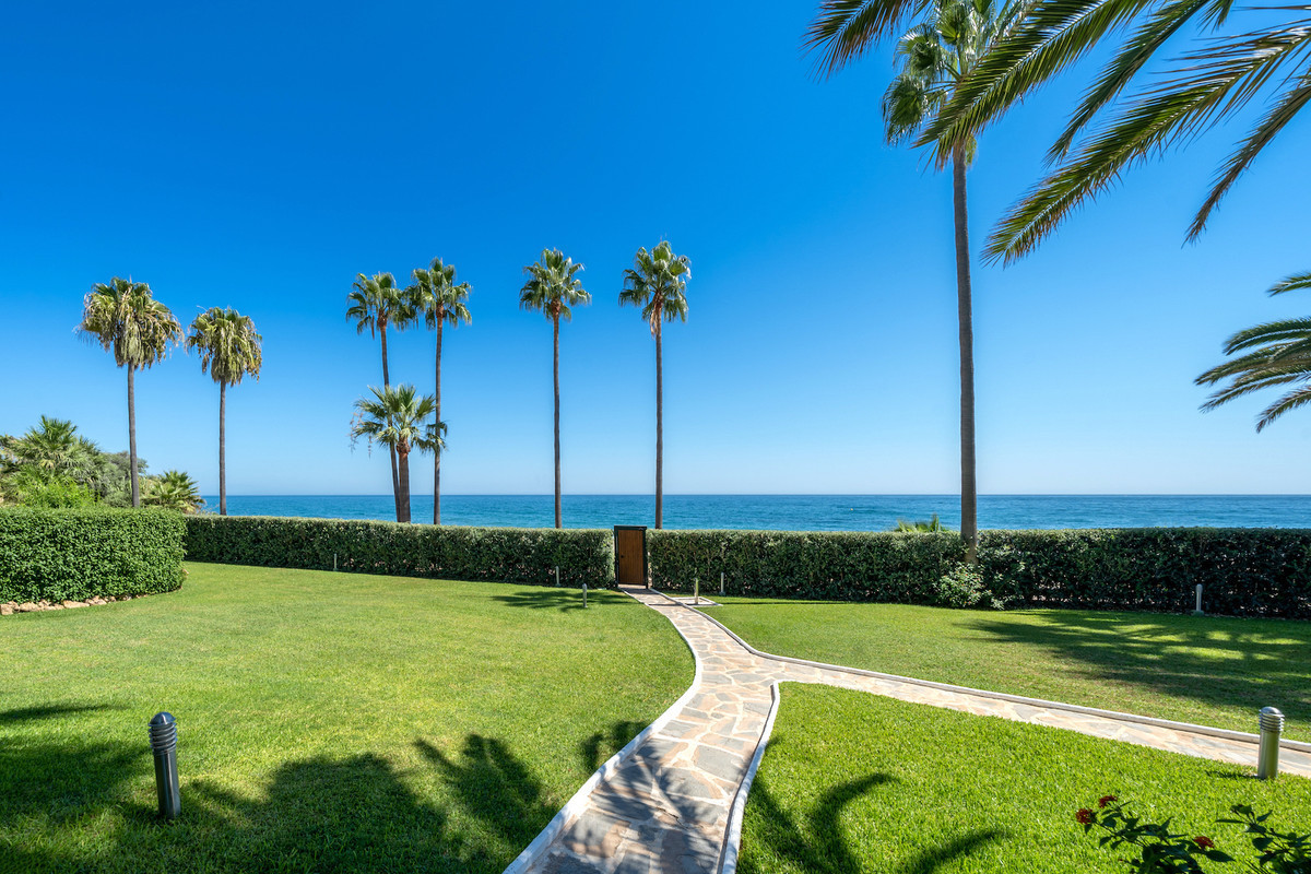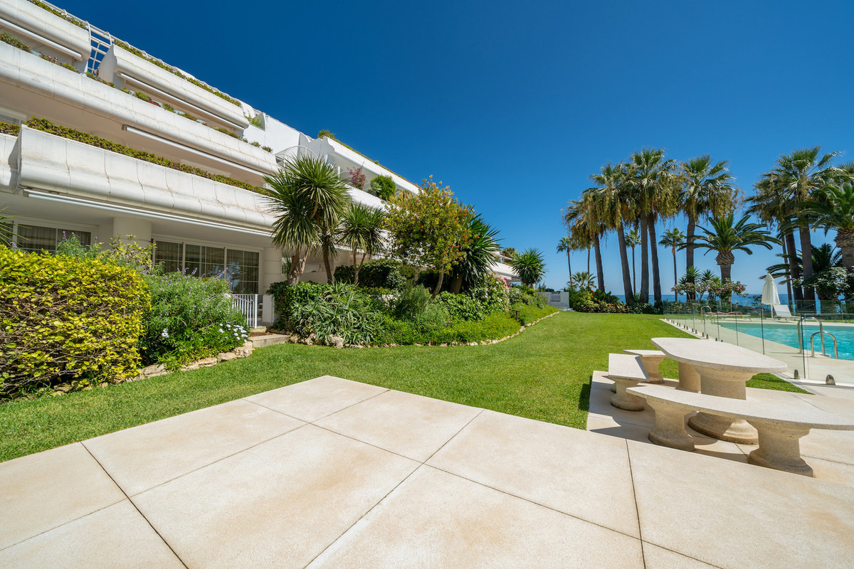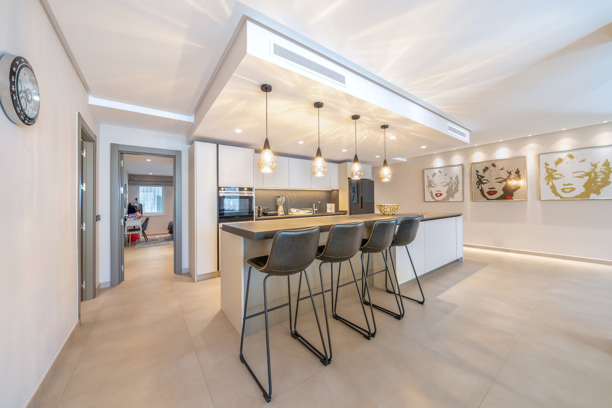 Amazing beachfront and fully furnished ground floor apartment offering a very spacious accommodation and located in the development Andalucia Beach on the New Golden Mile. Two apartments have been joined together to create this superb 4 bedroom family apartment. This fully renovated apartment features a new kitchen, bathrooms, electrics, plumbing and flooring with underfloor heating. Fabric wallpaper, feature walls and attractive lighting make the apartment both cosy and luxurious. The property consists of a large entrance hall, an ample lounge / dining room, an open plan fully fitted kitchen, 2 guest bedrooms with en-suite.