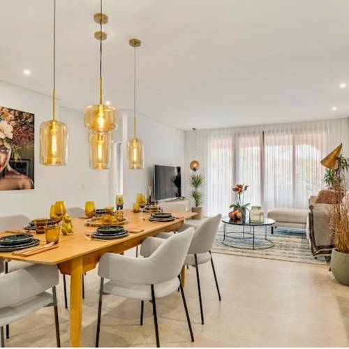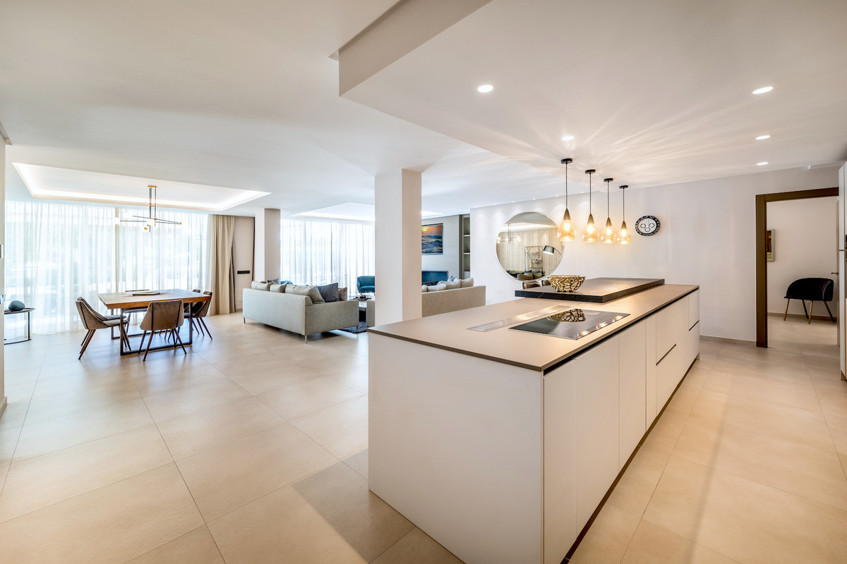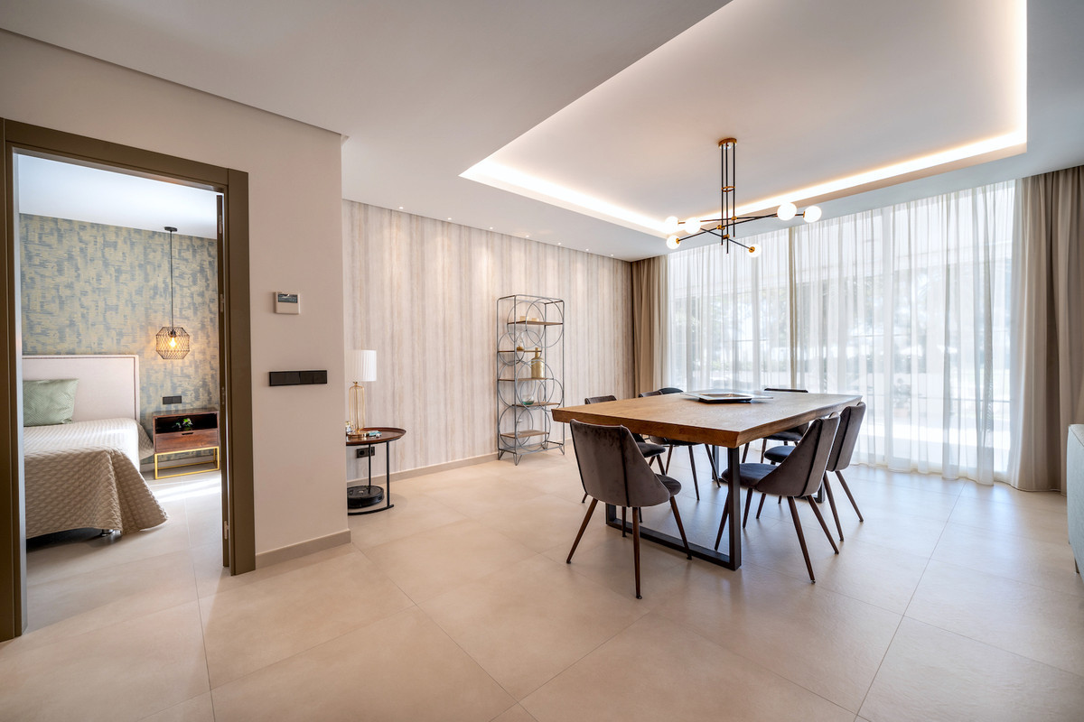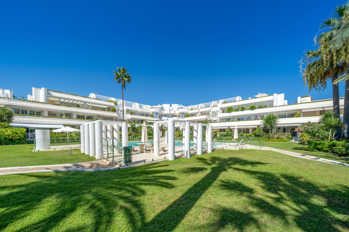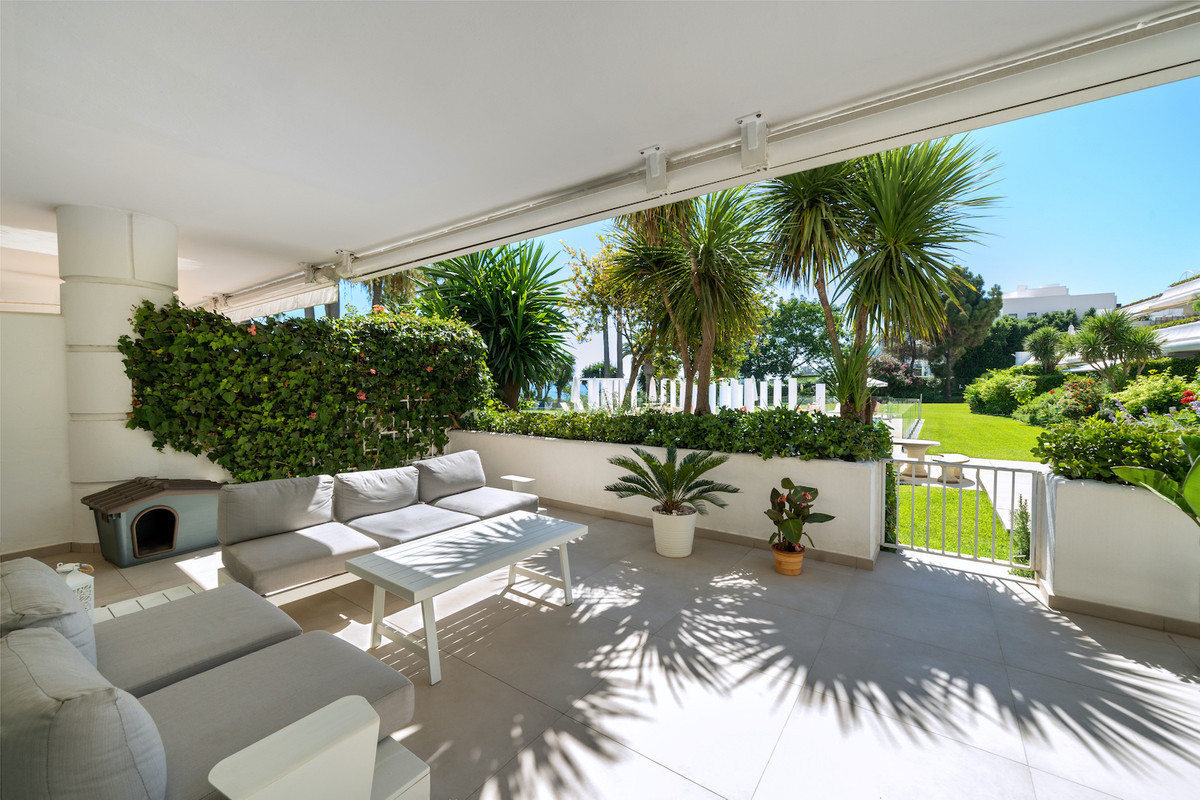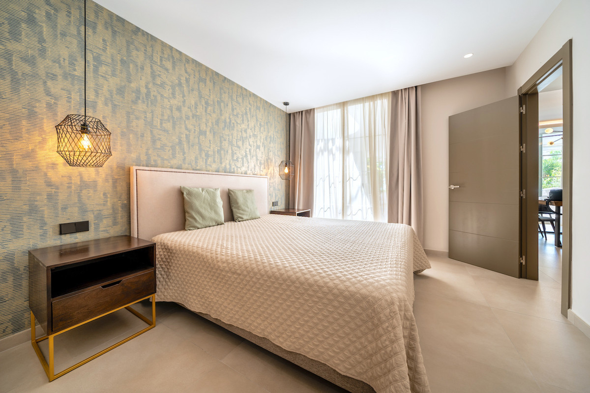 Amazing beachfront and fully furnished ground floor apartment offering a very spacious accommodation and located in the development Andalucia Beach on the New Golden Mile. Two apartments have been joined together to create this superb 4 bedroom family apartment. This fully renovated apartment features a new kitchen, bathrooms, electrics, plumbing and flooring with underfloor heating. Fabric wallpaper, feature walls and attractive lighting make the apartment both cosy and luxurious. The property consists of a large entrance hall, an ample lounge / dining room, an open plan fully fitted kitchen, 2 guest bedrooms with en-suite.