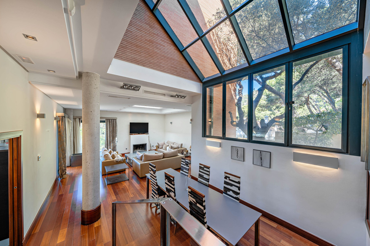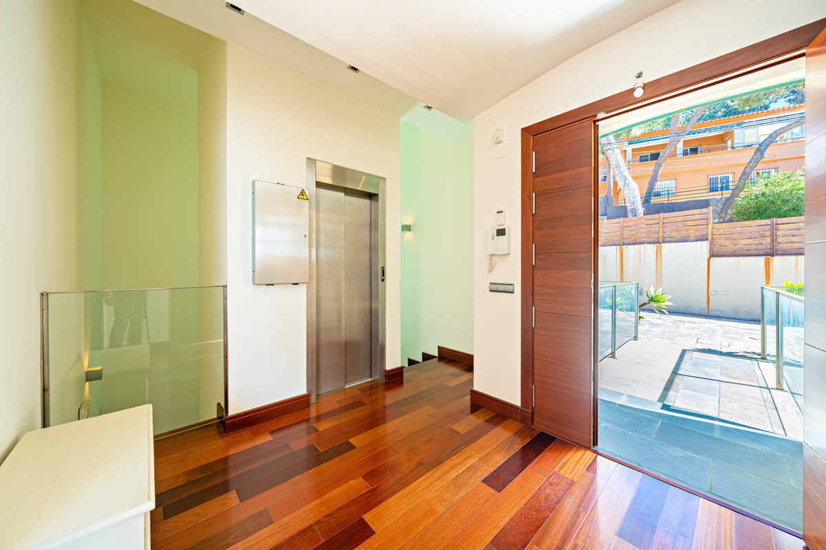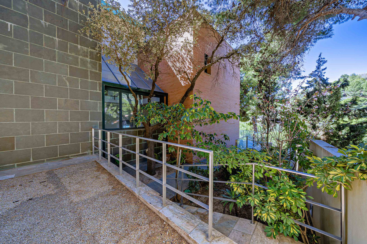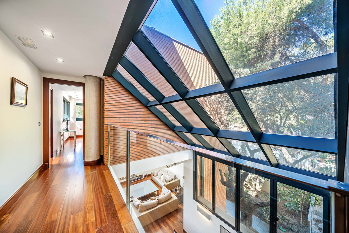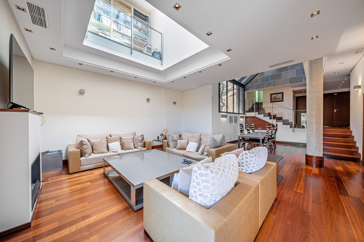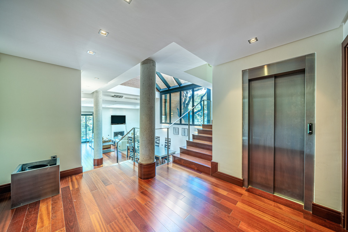 This property, boasting modern design and excellent qualities, has 2 entrances from different streets and a private lift. Distributed over 3 levels, it comprises, on entrance level: large luminous living-dining room featuring double-height ceilings, a fireplace and exit to the porch and further onto the yard with a swimming pool. This level also houses a guest bedroom, a bathroom and a fully-equipped kitchen.